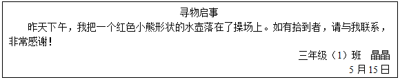 三年级(1)班的晶晶昨天(5月14日)下午放学后,把一个红色小熊形状的水壶落在了操场上。请你帮她写一则寻物启事。