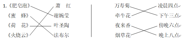 《肥皂泡》 萧红 《蜜蜂》 谢婉莹 《荷花》 叶圣陶 《火烧云》 法布尔 | 万寿菊 凌晨四点 牵牛花 下午三点 夜来香 傍晚六点 烟草花 晚上八点 |