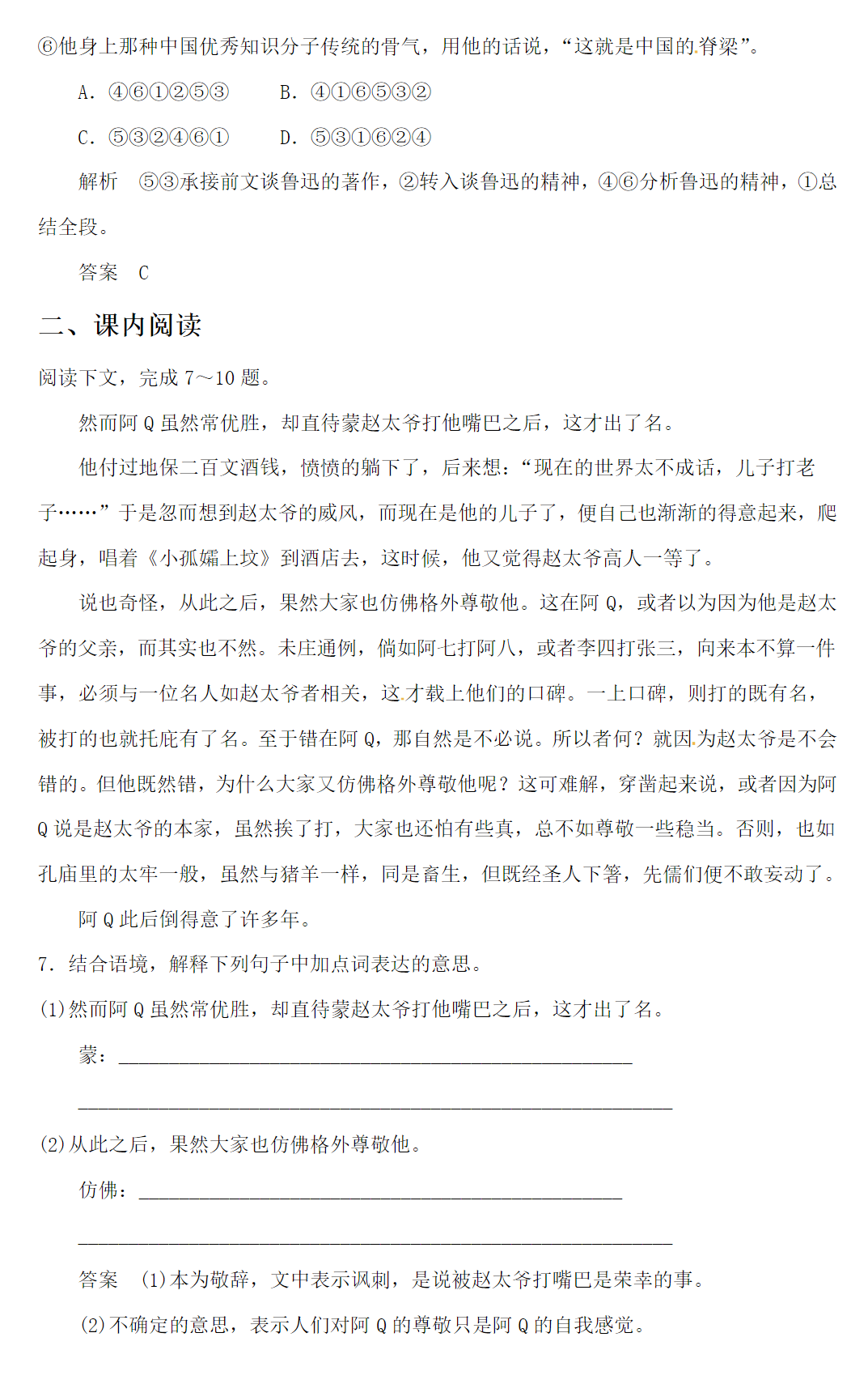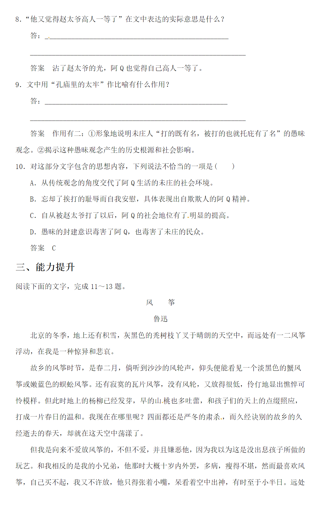 语文数学英语物理化学生物史地政治道德与法治美术音乐科学全部课程 ↓知识点:1 .理清脉络,概括人物形象。2.赏析写作特色。3.反思阿Q精神内涵。鲁迅:著名文学家、思想家、民主战士,五四新文化运动的重要参与者,中国现代文学的奠基人。毛泽东曾评价:“鲁迅的方向,就是中华民族新文化的方向。”鲁迅及其创作少年时家道衰落;青年时留学日本,希望以医学拯救祖国;弃医从文,力求改变国人的精神;从日本回国,创办《新青年》;发表了《孔乙己》《药》等短篇小说和大量杂文。鲁迅及其创作鲁迅的作品大体可分为小说、教文、散文诗和杂文:小 说——《呐喊》《彷徨》《故事新编》;散 文——《朝花夕拾》;散文诗——《野草》;杂 文——《坟》《热风》《华盖集》《华盖集续编》《且介亭杂文》《伪自由书》《准风月谈》《花边文学》等16部。创作背景辛亥革命推翻了两千多年的封建帝制,使民主共和的观念深入人心,但它没有完成反帝反封建的民主革命的伟大任务。资产阶级把有强烈革命要求的农民拒之门外。因此,广大农民在革命之后,仍处于帝国主义和封建主义的残酷剥削和压迫之下,承受着政治上的压迫,经济上的剥削和精神上的奴役。《阿Q正传》的问世《阿Q正传》于1921年12月4日至1922年2月12日在《晨报副刊》上连载,署名为巴人,后被收入《呐喊》中。《阿Q正传》出版后,深受中国和世界各国人民的喜爱,现已被译成多种文字,在世界上广泛流传。视频教学:练习:课件:教案:【教材分析】本文选自《阿Q正传》的第二、三章《优胜记略》和《续优胜记略》。相较于以往教材大多节选第七章《革命》和第八章《不准革命》,本教材节选的两章是集中描写阿Q的行为特征和精神精神特质的,是“阿Q精神”表现最为集中和典型的两章。本单元的教学又以“文学作品中的典型”为专题,因此教学目标就定位于阿Q人物形象的塑造上,从阿Q是怎样一类人物的典型,和作者如何塑造出这样一个人物,使之具有深广的思想蕴涵和典型性,两个方面进行教学。【学情分析】高三学生具有一定的文学作品的阅读能力和分析能力,特别是对于有具体的情节的,故事性较强的小说。问题是在于,如何引导学生从表面的情节内容,去思考文字背后所蕴含的深层意蕴。【设计意图】阿Q作为鲁迅笔下一个极为成功的典型人物,学生在学习课文前就有所了解。从教学方面来讲,应在此基础上有所深入和突破。让学生更理性地理解阿Q是怎样一个人物。人物形象的塑造是重点,但这仅仅是艺术手法方面的,更重要的是人物身上所具有的思想内涵和社会意义,这是本质内容方面的,而这一点又是要通过学生的深入思考才能体会到的,因此这是教学中的难点。在教学过程中,第二章的分析力求详尽,而第三章在第二章的基础上由学生来加以分析,课堂教学力求详略得当。【教学目标】1、评析鉴赏阿Q人物形象的塑造,把握小说塑造典型人物的主要方法。2、了解阿Q的思想性格特点,理解“阿Q精神”——“精神胜利法”的思想内涵。【重点和难点】1、重点:阿Q人物形象的塑造,把握小说如何塑造典型人物的。2、难点:“阿Q精神”的思想内涵和社会意义。【教学准备】学生预习,阅读全文,了解这两章的基本内容。【教学过程】教学内容教师活动学生活动教学说明导入新课 1、阿Q是鲁迅先生笔下的代表性人物,请同学谈谈对阿Q这个人物的了解和理解。1.提到阿Q,学生自然联想到阿Q精神,精神胜利法。但往往知其然而不知其所以然。1.从学生的感性认识出发,引入教学目标,激发学生更进一步了解人物性格,理解人物思想的兴趣。读议结合,分析鉴赏人物形象1.请同学从解释“优胜记略”和“续优胜记略”两个章节的标题入手,了解课文的主要内容。 2.请同学们阅读第二章,用文中的语言概括出阿Q是个怎样的人。 3.请同学再次精读第二章,圈划文中具体体现阿Q“先前阔”,见识高,“真能做”,以及阿Q精神胜利法的语句。 4.请同学依据上述圈划的描写阿Q言行的语句,分析阿Q的思想性格。 5.请同学思考作者是如何将阿Q这一人物塑造得如此鲜活逼真的。 6.请同学阅读第三章,用一句话概括这一章的主要内容。 7.精读第三章,思考阿Q和哪些人发生了冲突,阿Q各有怎样的不同的表现,从中看出阿Q怎样的性格。1.学生从小说所叙述的几个事件中,可解释出这两章的标题,“优胜记略”即“记阿Q获胜二三事” 2.学生通过讨论交流,找到第二章中概括阿Q这一人物的两个关键句:阿Q“先前阔”,见识高,而且“真能做”,本来几乎是一个“完人”了;阿Q想在心里的,后来每每说出来,所以凡有和阿Q玩笑的人们,几乎全知道他有一种精神上的胜利法。 3.交流、讨论、明确:“我们先前——比你阔的多啦!你算是什么东西!”“先前阔”,是阿Q独和人口角时候间或瞪着眼说的口头禅,其实阿Q既没有家,也没有固定的职业;“他想:我的儿子会阔得多啦”,其实阿Q连老婆都还没有;“加以进了几回城,阿Q自然更自负,然而他又很鄙薄城里人”;“只是有一回,一个老头子颂扬说‘阿Q真能做!’”;“我总算被儿子打了”;“打虫豸,好不好?我是虫豸——还不放么?”;“他觉得他是第一个能够自轻自贱的人,除了‘自轻自贱’不算外,余下的就是‘第一个’。状元不也是‘第一个’么?‘你算是什么东西’呢 !?”;“但真所谓‘塞翁失马安