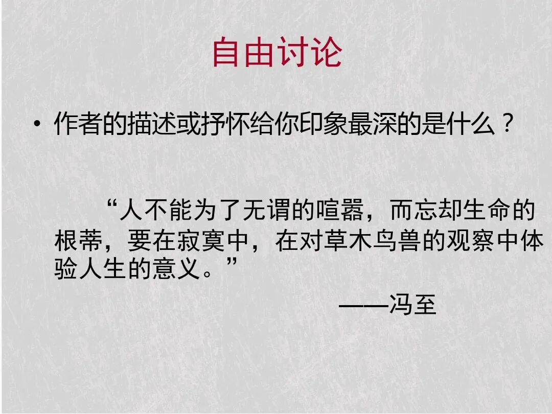 (引领学生研讨时,主要突出“明净、含蓄,在平凡事物中见出崇高,在朴素文字中见出华美”这一特点)