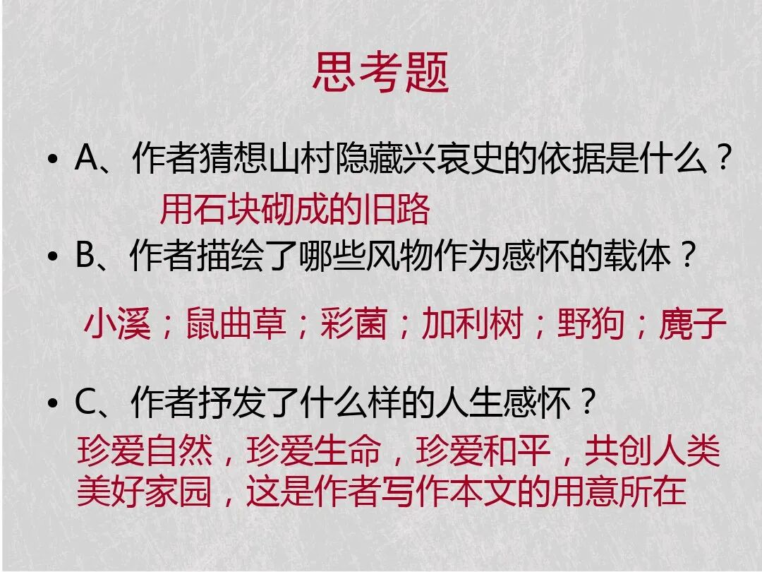 (2)作者引用宋代诗人李之仪的《卜算子》中的诗句“日日思君不见君,共饮长江水”的有何巧妙之处?一棵小小的鼠曲草、一些彩菌各承载了作者哪些丰富的联想?能够跨越历史时空的,除了看得见的自然事物,还有哪些是看不见的?(目的是让学生充分体验作者在这个山林所体验到的,让他们思考作者所思考到的,比如关于生存的意义的话题:生死、病苦、兴亡,等等。)