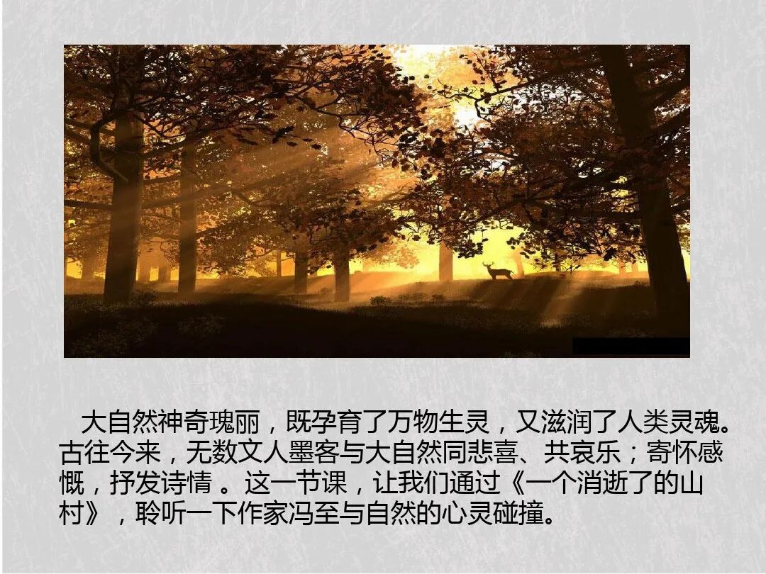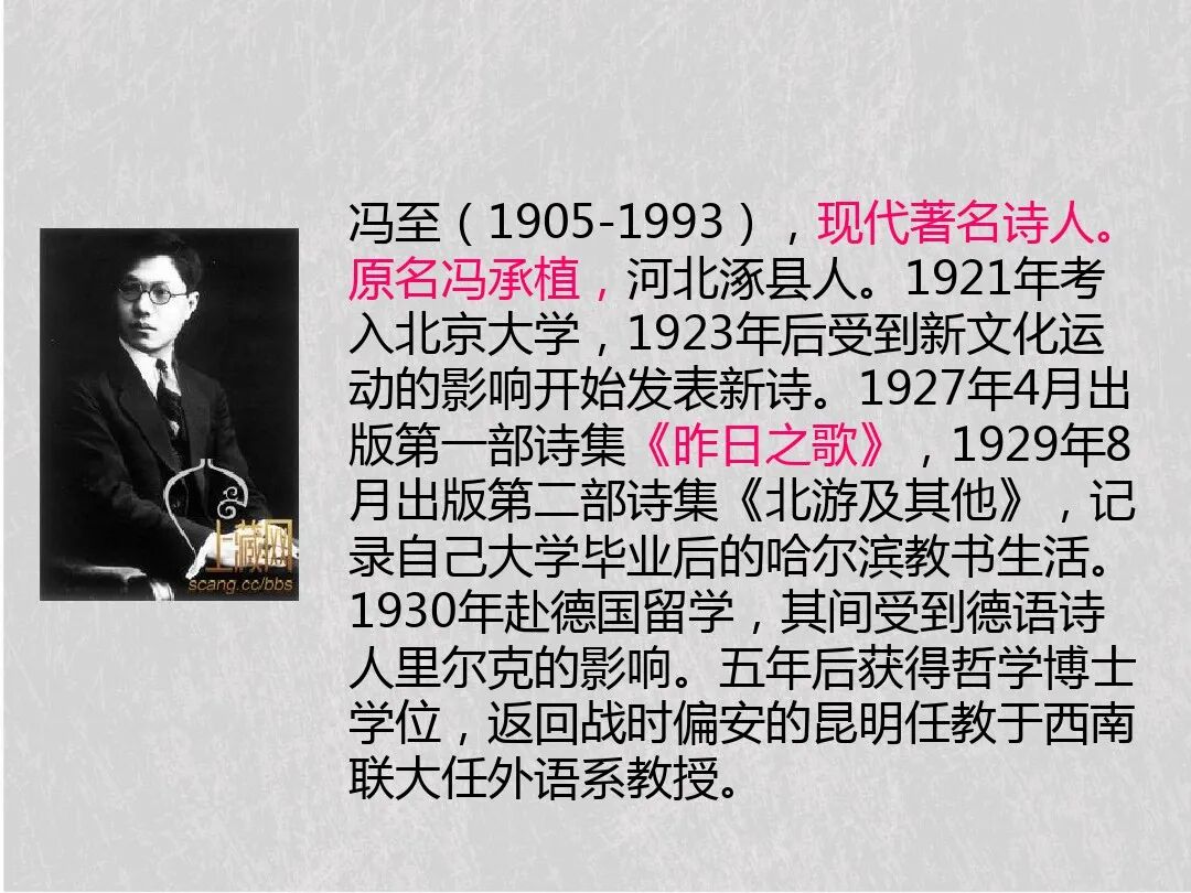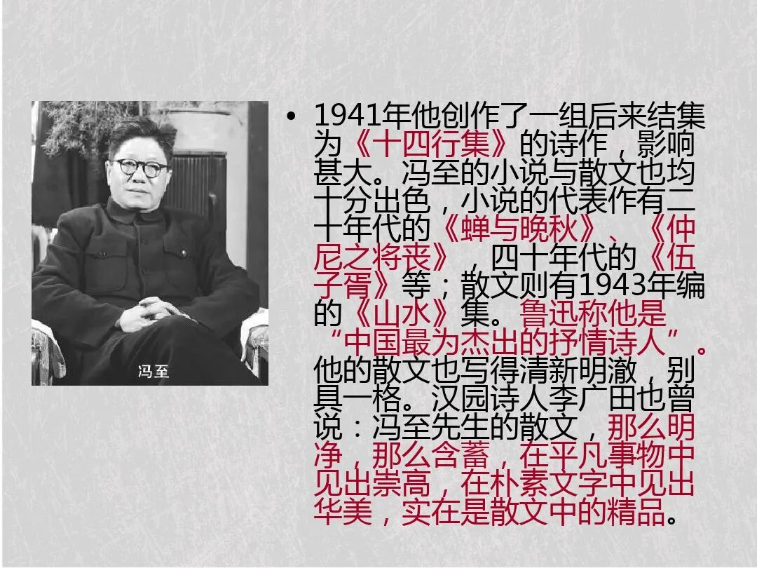 大自然的景物有百分之一能写进历史,千分之一能成为景观,万分之一能激发诗情。这就是我们赖以生存的大自然的神奇瑰丽之处。她繁富缤纷,延往续来,既孕育了万物生灵,又滋润了人类灵魂。古往今来,无数文人墨客面对那即使是只有万分之一才能激发诗情的景物,寄怀感慨,与自然同悲喜、共哀乐。这一节课,就让我们一起走近作家冯至,聆听他与自然的心灵碰撞。