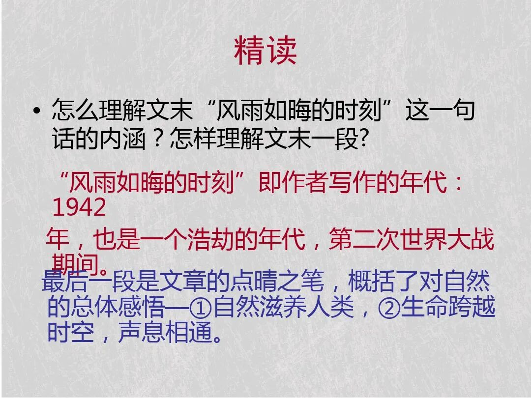 明确:“风雨如晦的时刻”即作者写作的年代:1942年,也是一个浩劫的年代。作者的感悟带