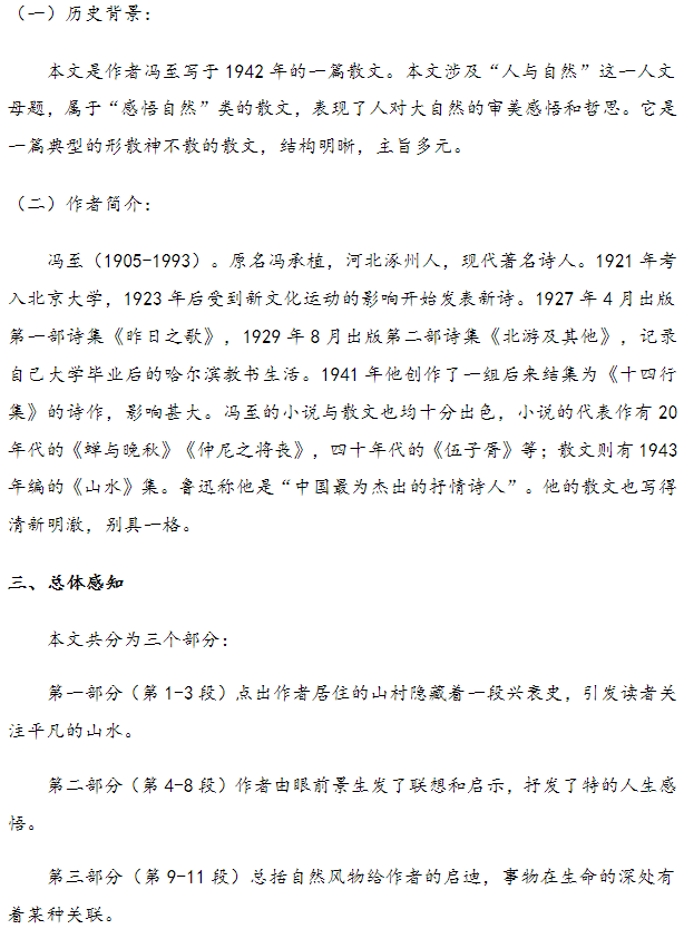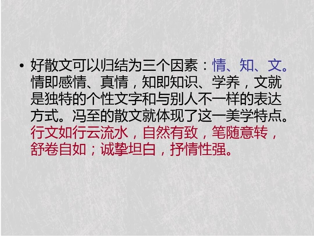 老师引导:好散文归结为三个因素:情、知、文。情即感情、真情,知即知识、学养,文就是独特的个性文字和与别人不一样的表达方式。冯至的散文就体现了这一美学特点。行文如行云流水,自然有致,笔随意转,舒卷自如;诚挚坦白,抒情性强。请同学们打开书,放声朗读这篇文章。