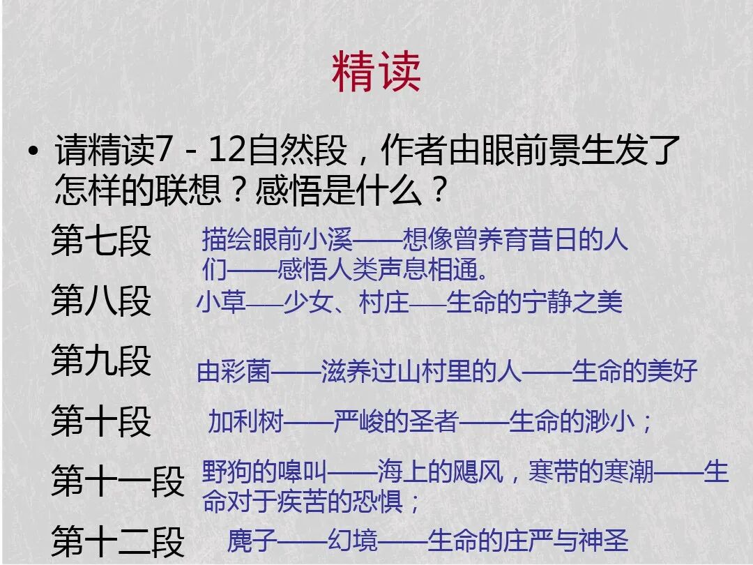 老师引导:本文侧重于对自然和人生的双重感悟。解读的着眼点应放在结合以下几个问题思考,进而理清文章思路,为探究文本的精髓作铺垫。请同学们带着以下问题阅读课文、寻找答案的同时,就能够初步了解课文内容。