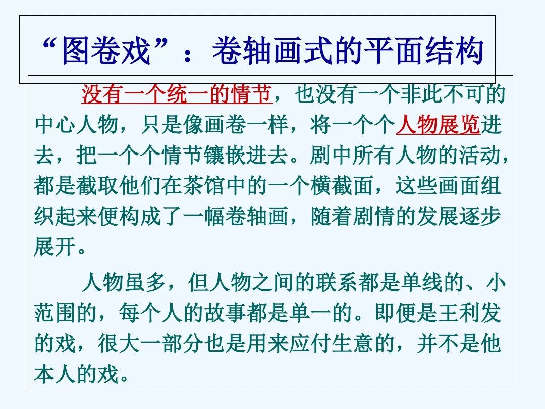 5、《茶馆》的谋篇布局独具匠心。全剧没有贯穿到底的矛盾斗争,是一出以人物带故事的话剧。它由几乎没有联系的几个小故事组成。幕与幕之间在情节上的联系,表面上看是不太紧密的,但仔细分析,便可发现三幕之间的联系是作者描写的一种深层的政治意识。