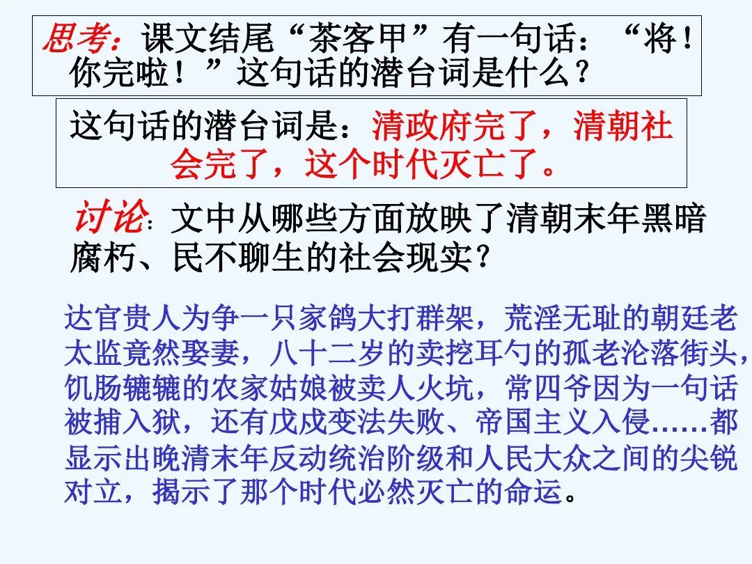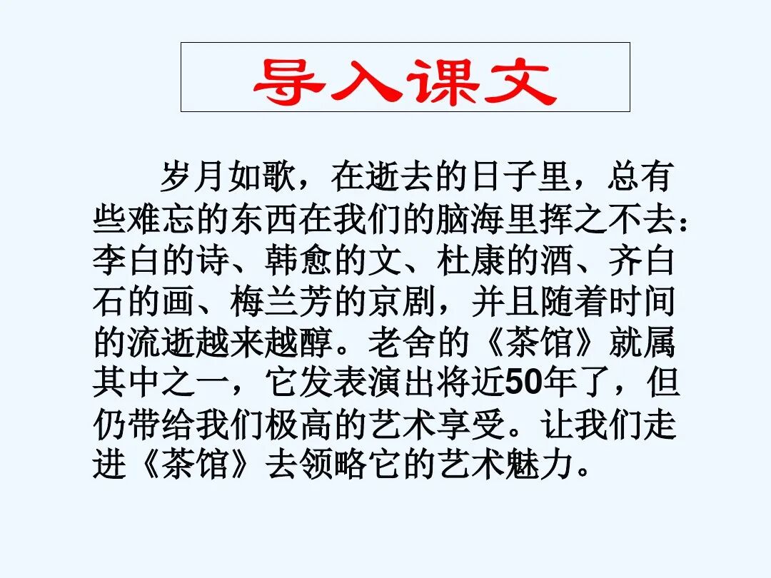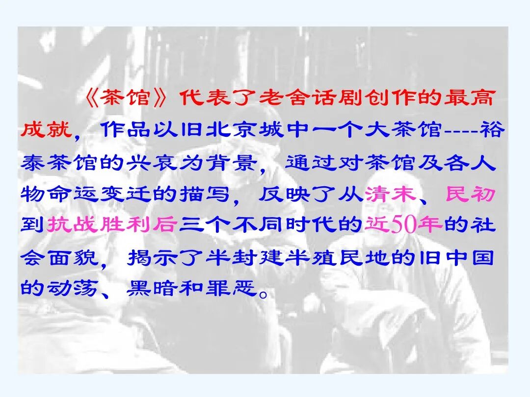4、《茶馆》通过“裕泰”的茶馆陈设由古朴一新式一简陋的变化,昭示了茶馆在各个特定历史时期中的时代特征和文化特征。老舍以茶馆为载体,以小见大,反映社会的变革。