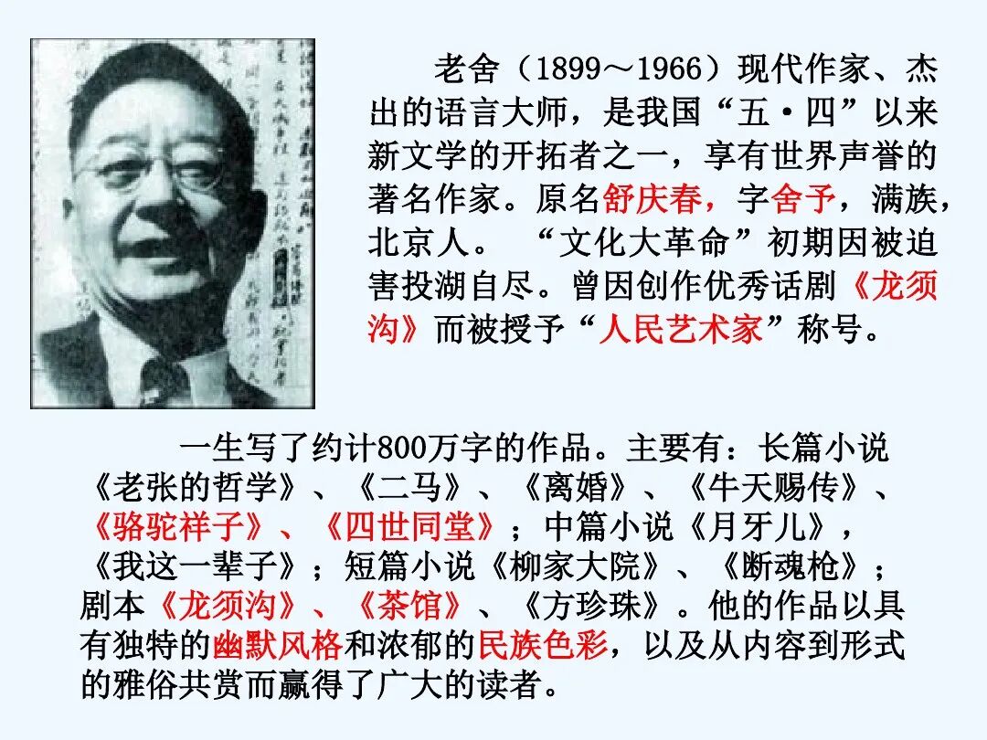 6、作者老舍塑造人物形象有其独特的方式。着重刻画时代的、阶级的、职业的和气质的特点以及地方色彩,作出各种社会典型的艺术概括,通过浮雕般栩栩如生的人物造型,反映出不同的社会面貌。