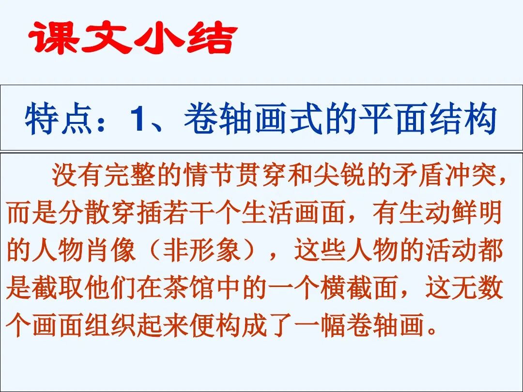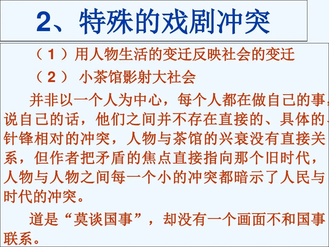 9、作者通过纵、横两个侧面来反映广阔的社会生活。横的侧面:作者选取了裕泰茶馆这个象征被摧残得衰败不堪的旧中国为观察窗口,通过对出入茶馆的各种人物的描写,来反映时代变迁。纵的侧面:通过贯穿全剧的人物生活变迁,来反映社会演变。