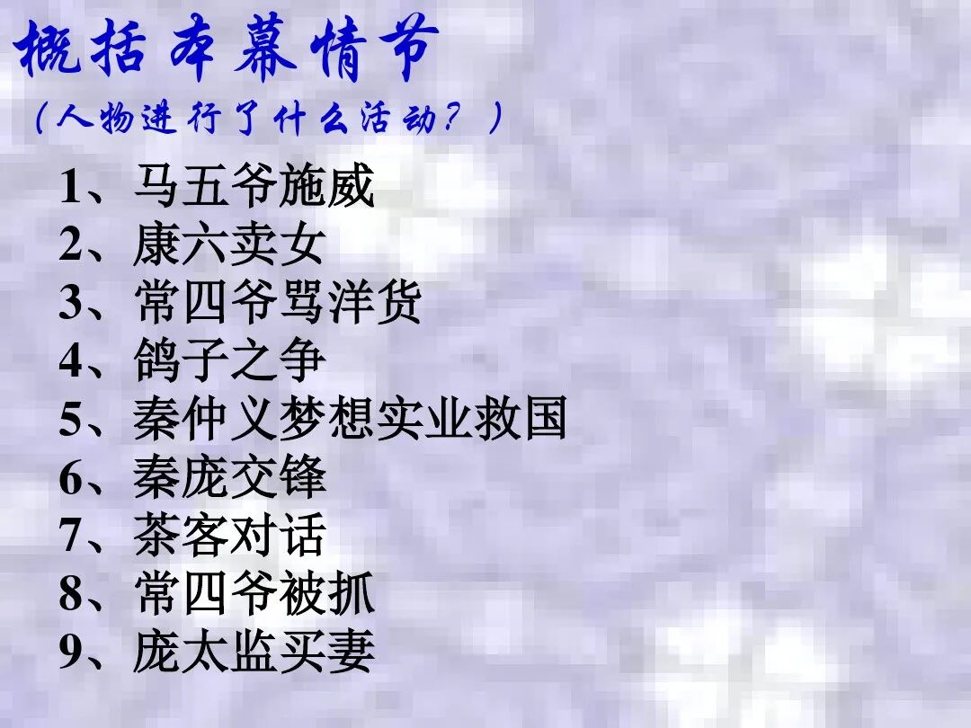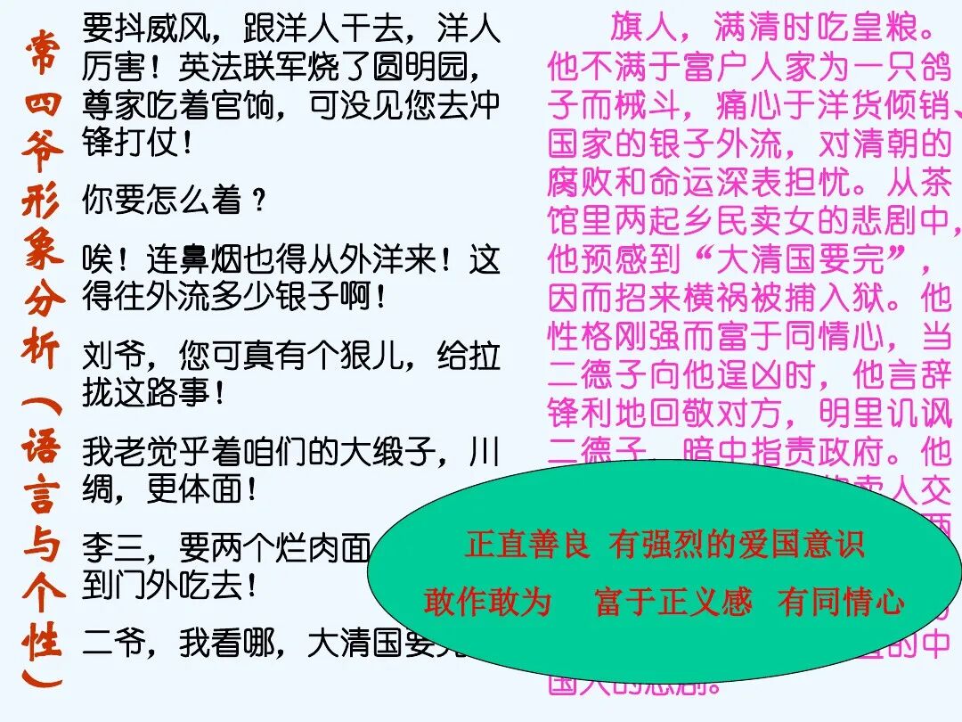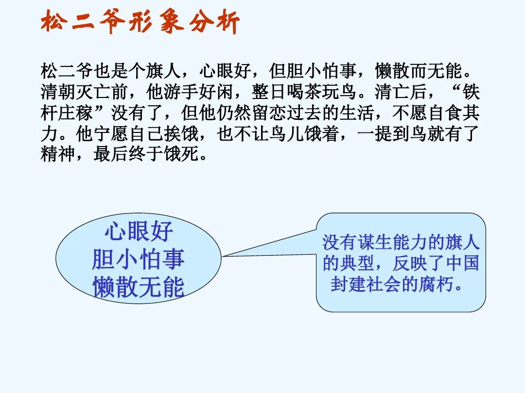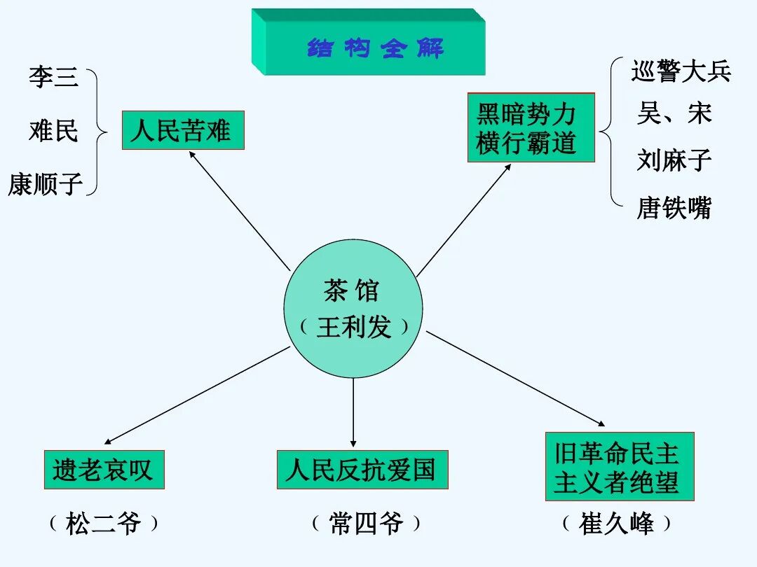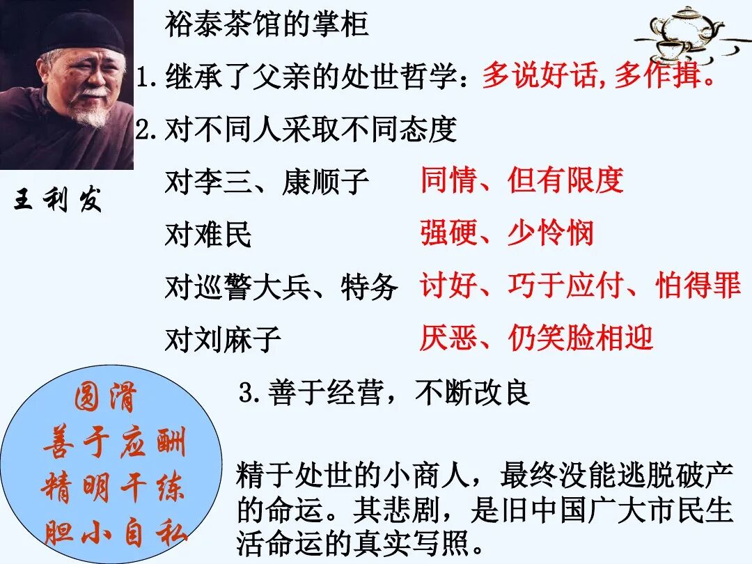 ★王利发:王利发是裕泰茶馆的掌柜,也是贯穿全剧的人物。他从父亲手里继承了裕泰茶馆,也继承了他的处世哲学,即多说好话,多作揖。他胆小、自私,又精明、干练、善于应酬,对不同的人采取不同的态度。在黑暗的旧中国,尽管王利发善于应酬,善于经营,不断改良,却无法抵御各种反动势力的欺压。他对此也抱有强烈的不满,但表达得十分含蓄。就是这样一个精于处世的小商人,最终仍然没能逃脱破产的命运。王利发的悲剧,是旧中国广大市民生活命运的真实写照。★常四爷:常四爷是旗人,在满清时吃皇粮。但是他对腐败的清王朝不满,对洋人更加痛恨。第一幕中因一句“大清国要完”被抓起来,坐了一年的监狱。出狱后参加义和团,以后又凭力气靠卖菜为生。他正直,善良,敢作敢为,富有正义感。他不讳言他的不满,对抓过他的特务仍然很强硬,对正在发愁的王利发则雪中送炭。就是这样一个人,最后也穷困潦倒,绝望地喊出:“我爱咱们的国呀,可是谁爱我呢?”这个形象代表了不甘受奴役的中国人,反映出旧中国人民的反抗情绪。★松二爷:松二爷也是个旗人,心眼好,但胆小怕事,懒散而无能。清朝灭亡前,他游手好闲,整日喝茶玩鸟。清亡后,“铁杆庄稼”没有了,但他仍然留恋过去的生活,不愿自食其力。他宁愿自己挨饿,也不让鸟儿饿着,一提到鸟就有了精神,最后终于饿死。这是一个没有谋生能力的旗人的典型,反映了中国封建社会的腐朽。★秦仲义:秦仲义是裕泰茶馆的房东,是维新运动后出现在政治舞台上的新生民族资本家。他年轻时血气方刚,态度傲慢,目空一切,甚至敢于同有权有势的庞太监作斗争。他有一个自认为很远大的理想,就是“实业救国”。他天真地认为,可以用经济竞争的手段,把国家经济命脉掌握在中国人手里,就能战胜洋人,救国救民。但他惨淡经营了几十年的“实业”却被国民党政府没收了,心如死灰的他,到老年却悟出了这样一个荒唐的“道理”:“有钱呀,就应该吃喝嫖赌,胡作非为,可千万别干好事!”在这一人物身上,体现了民族资产阶级既有斗争性又有软弱性,既有干事业的狂热一面,又有在挫折面前软弱灰心一面的特点。视频教学: