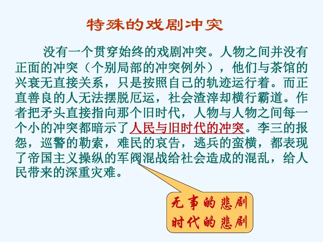 7、《茶馆》中有不少悲剧性的场面,但是全剧的基调却是喜剧的,而且即使是悲惨的情节和细节也往往以幽默的笔法表现出来。