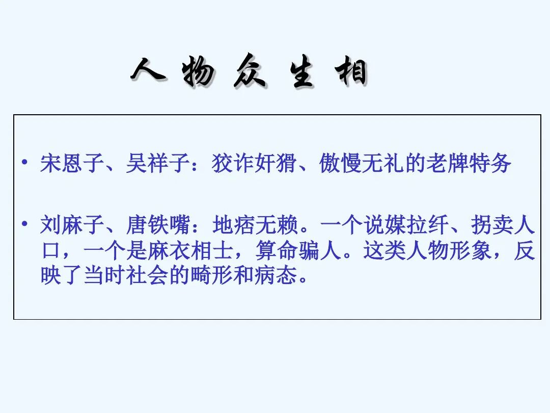 2、剧本中出场的人物近50人,除茶馆老板之外,有吃皇粮的旗人、办实业的资本家、清宫里的太监、信奉洋教的教士、穷困潦倒的农民,以及特务、打手、警察、流氓、相士等,人物众多但性格鲜明,能够“闻其声知其人”,“三言两语就勾出一个人物形象的轮廓来”。作品通过茶馆老板王利发对祖传“裕泰茶馆”的惨淡经营,描写他虽然精明圆滑、呕心沥血,但终于挡不住衰败的结局,从侧面反映了中国社会的走向。