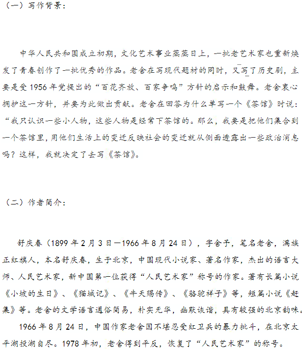 语文数学英语物理化学生物史地政治道德与法治美术音乐科学全部课程 ↓知识点:知识清单1、《茶馆》是现代文学家老舍于1956年创作的话剧,剧作展示了戊戌变法、军阀混战和新中国成立前夕三个时代近半个世纪的社会风云变化。通过一个叫裕泰的茶馆揭示了近半个世纪中国社会的黑暗腐败、光怪陆离,以及在这个社会中的芸芸众生。2、剧本中出场的人物近50人,除茶馆老板之外,有吃皇粮的旗人、办实业的资本家、清宫里的太监、信奉洋教的教士、穷困潦倒的农民,以及特务、打手、警察、流氓、相士等,人物众多但性格鲜明,能够“闻其声知其人”,“三言两语就勾出一个人物形象的轮廓来”。作品通过茶馆老板王利发对祖传“裕泰茶馆”的惨淡经营,描写他虽然精明圆滑、呕心沥血,但终于挡不住衰败的结局,从侧面反映了中国社会的走向。3、《茶馆》结构上分三幕,以老北京一家叫裕泰的大茶馆的兴衰变迁为背景,展示了从清末到北洋军阀时期再到抗战胜利以后的近50年间,北京的社会风貌和各阶层的不同人物的生活变迁。每一幕写一个时代,北京各阶层的三教九流人物,出入于这家大茶馆,全剧展示出来的是一幅幅气势庞大的历史画卷,形象地说明了旧中国的必然灭亡和新中国诞生的必然性。4、《茶馆》通过“裕泰”的茶馆陈设由古朴一新式一简陋的变化,昭示了茶馆在各个特定历史时期中的时代特征和文化特征。老舍以茶馆为载体,以小见大,反映社会的变革。5、《茶馆》的谋篇布局独具匠心。全剧没有贯穿到底的矛盾斗争,是一出以人物带故事的话剧。它由几乎没有联系的几个小故事组成。幕与幕之间在情节上的联系,表面上看是不太紧密的,但仔细分析,便可发现三幕之间的联系是作者描写的一种深层的政治意识。6、作者老舍塑造人物形象有其独特的方式。着重刻画时代的、阶级的、职业的和气质的特点以及地方色彩,作出各种社会典型的艺术概括,通过浮雕般栩栩如生的人物造型,反映出不同的社会面貌。7、《茶馆》中有不少悲剧性的场面,但是全剧的基调却是喜剧的,而且即使是悲惨的情节和细节也往往以幽默的笔法表现出来。8、《茶馆》的语言特色最主要的就是真实、形象。9、作者通过纵、横两个侧面来反映广阔的社会生活。横的侧面:作者选取了裕泰茶馆这个象征被摧残得衰败不堪的旧中国为观察窗口,通过对出入茶馆的各种人物的描写,来反映时代变迁。纵的侧面:通过贯穿全剧的人物生活变迁,来反映社会演变。人物形象★王利发:王利发是裕泰茶馆的掌柜,也是贯穿全剧的人物。他从父亲手里继承了裕泰茶馆,也继承了他的处世哲学,即多说好话,多作揖。他胆小、自私,又精明、干练、善于应酬,对不同的人采取不同的态度。在黑暗的旧中国,尽管王利发善于应酬,善于经营,不断改良,却无法抵御各种反动势力的欺压。他对此也抱有强烈的不满,但表达得十分含蓄。就是这样一个精于处世的小商人,最终仍然没能逃脱破产的命运。王利发的悲剧,是旧中国广大市民生活命运的真实写照。★常四爷:常四爷是旗人,在满清时吃皇粮。但是他对腐败的清王朝不满,对洋人更加痛恨。第一幕中因一句“大清国要完”被抓起来,坐了一年的监狱。出狱后参加义和团,以后又凭力气靠卖菜为生。他正直,善良,敢作敢为,富有正义感。他不讳言他的不满,对抓过他的特务仍然很强硬,对正在发愁的王利发则雪中送炭。就是这样一个人,最后也穷困潦倒,绝望地喊出:“我爱咱们的国呀,可是谁爱我呢?”这个形象代表了不甘受奴役的中国人,反映出旧中国人民的反抗情绪。★松二爷:松二爷也是个旗人,心眼好,但胆小怕事,懒散而无能。清朝灭亡前,他游手好闲,整日喝茶玩鸟。清亡后,“铁杆庄稼”没有了,但他仍然留恋过去的生活,不愿自食其力。他宁愿自己挨饿,也不让鸟儿饿着,一提到鸟就有了精神,最后终于饿死。这是一个没有谋生能力的旗人的典型,反映了中国封建社会的腐朽。★秦仲义:秦仲义是裕泰茶馆的房东,是维新运动后出现在政治舞台上的新生民族资本家。他年轻时血气方刚,态度傲慢,目空一切,甚至敢于同有权有势的庞太监作斗争。他有一个自认为很远大的理想,就是“实业救国”。他天真地认为,可以用经济竞争的手段,把国家经济命脉掌握在中国人手里,就能战胜洋人,救国救民。但他惨淡经营了几十年的“实业”却被国民党政府没收了,心如死灰的他,到老年却悟出了这样一个荒唐的“道理”:“有钱呀,就应该吃喝嫖赌,胡作非为,可千万别干好事!”在这一人物身上,体现了民族资产阶级既有斗争性又有软弱性,既有干事业的狂热一面,又有在挫折面前软弱灰心一面的特点。视频教学:练习:课件:教案:【教学目标】1.认识《茶馆》的艺术价值。它不仅是老舍的戏剧代表作,而且是中国20世纪下半叶惟一一部得到公认的戏剧经典之作,同时也是“京派话剧”的典范之作。 2.领悟戏剧语言的艺术魅力,如戏剧台词的性格化、动作性等。 3.了解《茶馆》与传统话剧的区别,从而认识戏剧的创新特性。 教学设想 一、把握“茶馆”结构上的创新。 《茶馆》三幕戏,截取了三个旧中国反动时代的横断面。第一幕是戊戌政变失败之后的清朝末年;第二幕是袁世凯死后的军阀混战时代;第三幕是抗战胜利后国民党反动统治行将崩溃的时期。其目的是不