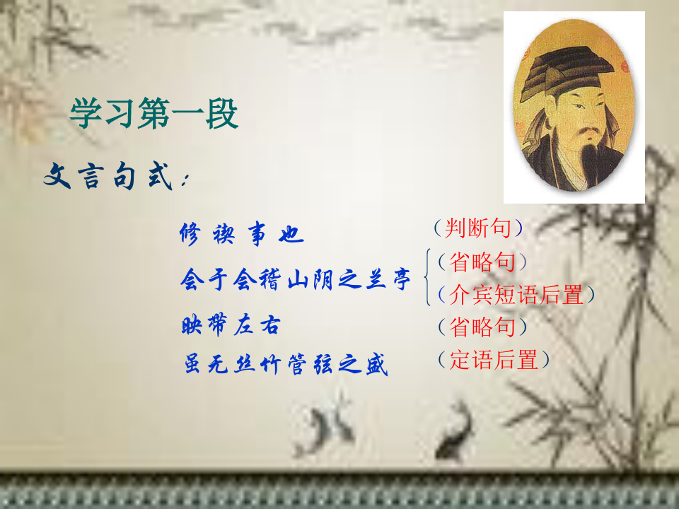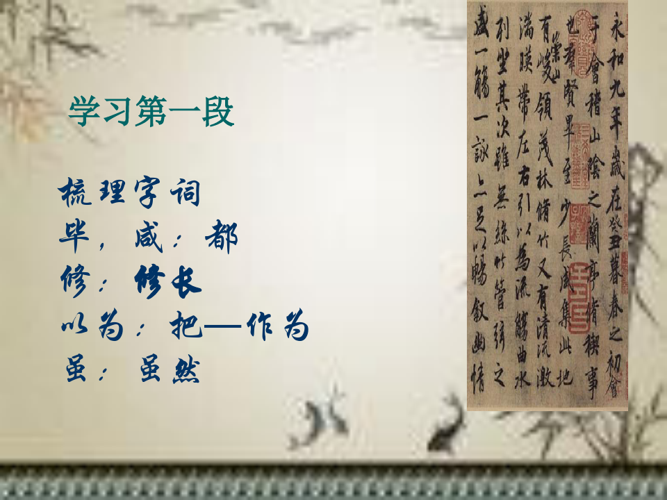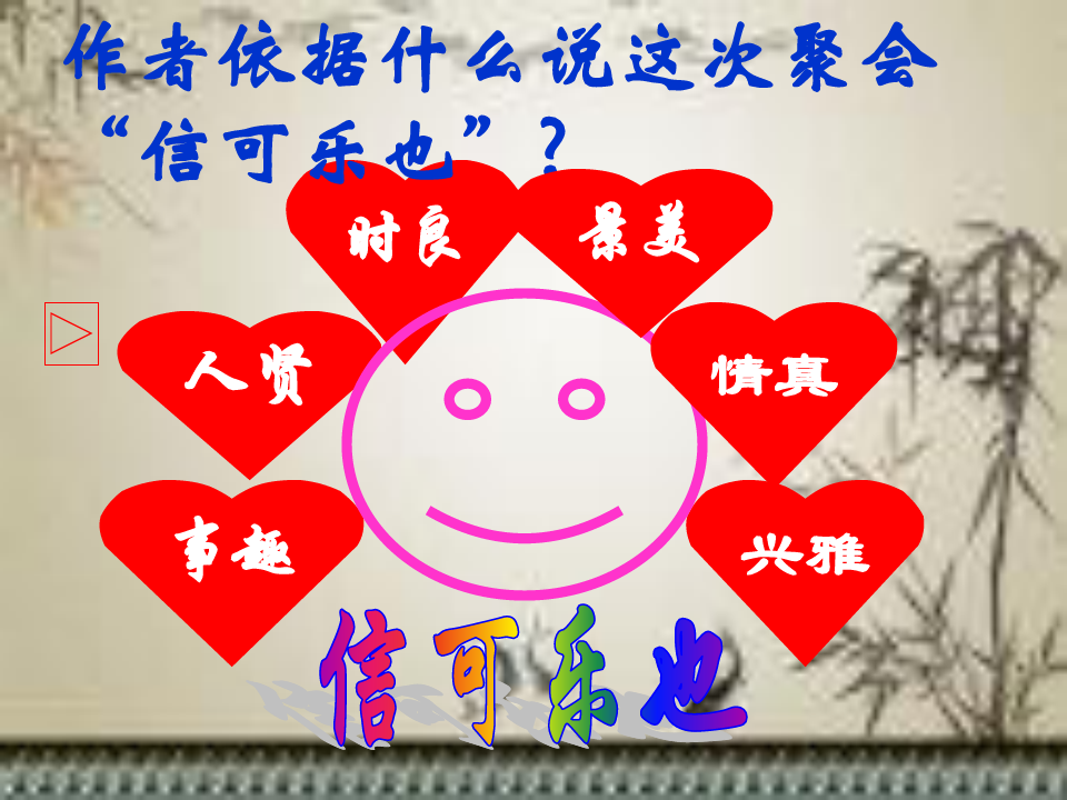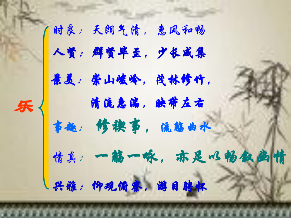 同学们大声自由朗读第一段,思考:兰亭聚会,作者的“乐”在何处?表现在哪些方面?(哪些事物或景物引起了他的乐呢?)