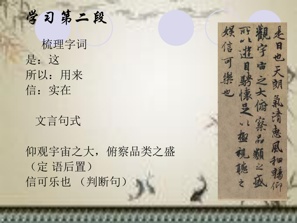 ②仰观宇宙之大,俯察品类之盛,所以游目骋怀。(①广大、繁茂是什么词性?形容词,我们看到的应该是物象,所以这句话翻译的时候,我们要注意它是倒装句,定语后置句。抬头仰望广大无边的天空,低首俯视兴盛繁茂的万物,②用来,表凭借。这样用来纵展眼力、开阔胸怀。)