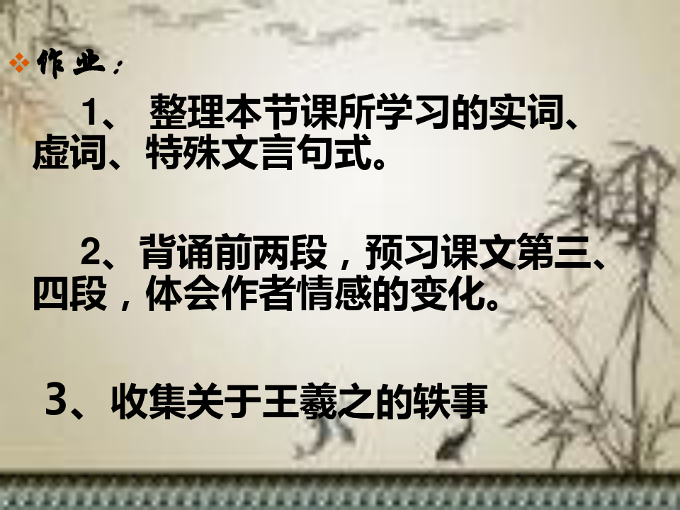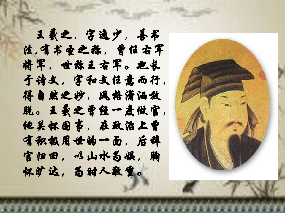 文章虽已“悲”字做结,但这里的"悲"不同于上一段的“痛”,是作者超越了人生无常之痛的理性思考,是对短暂生命的珍惜与热爱。王羲之虽然没有在文中直接给我们点出来这一点,但他究竟有没有积极地对抗这种生命的虚无?王羲之被尊称为?“书圣”!他的作品流传千古,他是天生如此的么?他肯定经历什么?刻苦的磨练。王羲之7岁时开始练习书法,不停地用手指头在衣襟上划着,时间久了,身上的衣服都划破了。他曾经在池塘边练习写字,每次写完,就在池塘里洗涤笔砚。时间久了,整个池塘的水都染黑了。