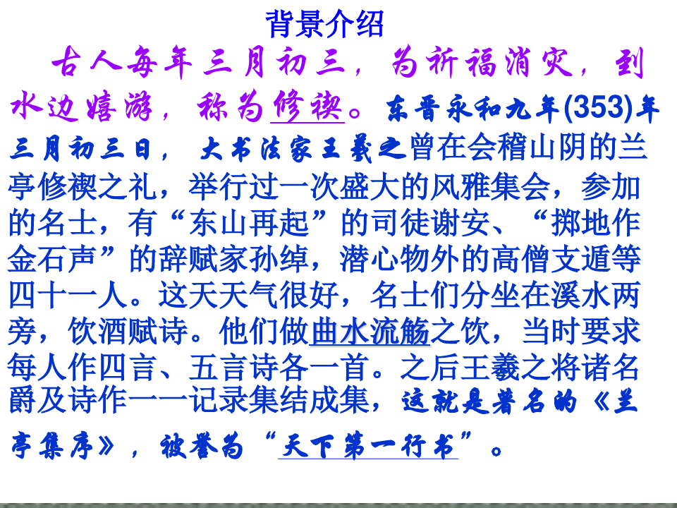 天气好,风景好,难道心情就一定会好吗?如果宋江带领梁山好汉跑到兰亭对王羲之说:“小王啊,我们一起来大口吃肉大碗喝酒吧。”那样王羲之的心情还好吗?当然不好。所以人的心情好不好也决定于我们跟谁在一起。群贤毕至,少长咸集。众多的贤士在一起,他们在一起有着同样的志趣爱好,可谓是?志同道合,志同道合之乐。他们在一起干什么呀?流觞曲水,列坐其次,一觞一咏,足以畅叙幽情。