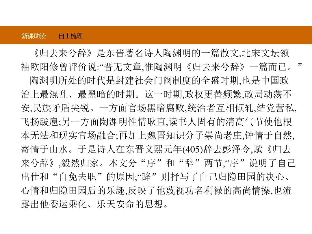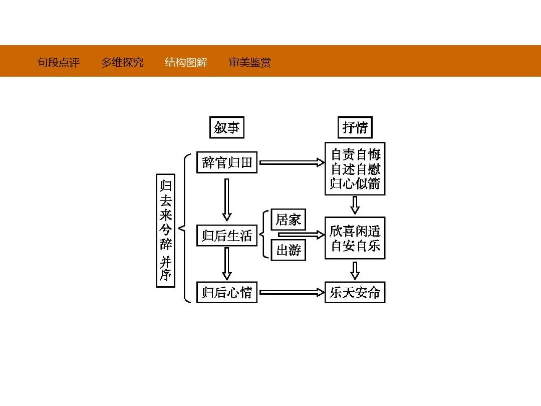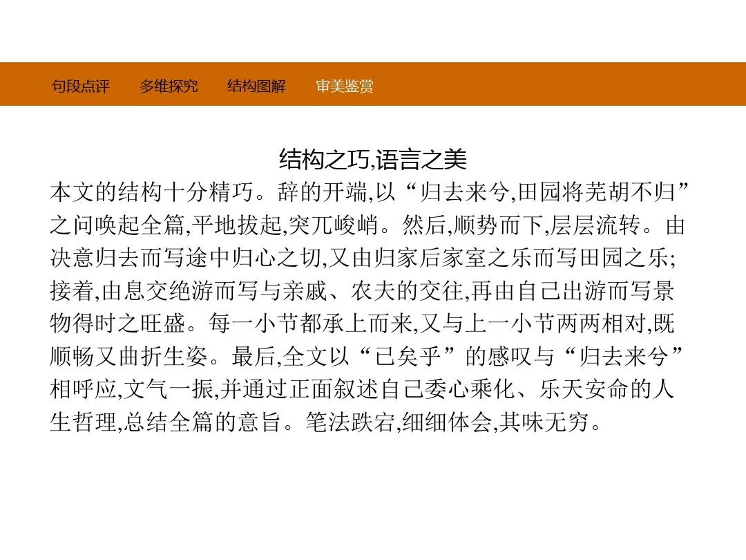 全文以“田园将芜胡不归”领起,接着以“归思”、“归途”、“归家”、“归意”为顺序,依次抒写,最后以“乐夫天命”作结,表达了诗人鄙弃官场,向往田园的感情。