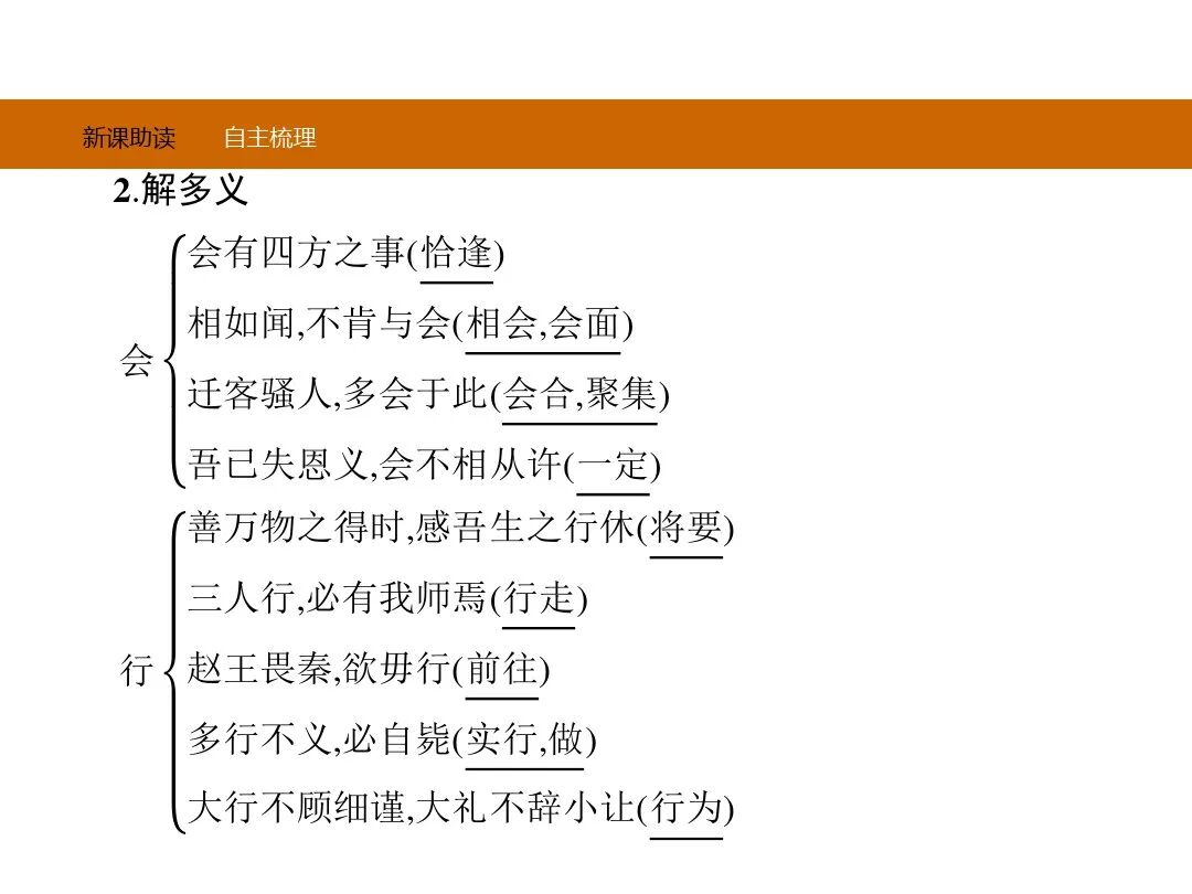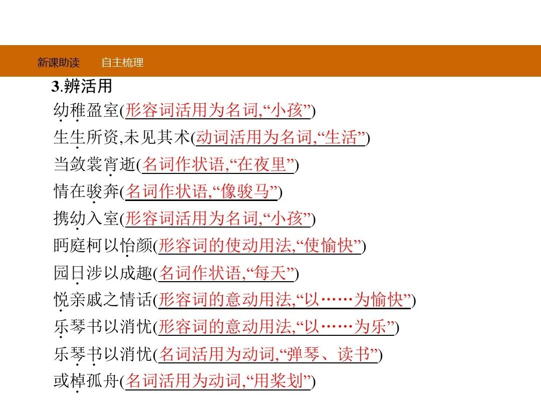 役(役使)、谏(谏正、劝止)、觞(酒杯)、策(拄着)、憩(休息)、岫(山穴)、景(太阳)、盘桓(徘徊、留恋不去)、畴(田地)、棹(划船)、窈窕(曲折幽深的样子)、行(将要)、期(至、及)、聊(姑且)。