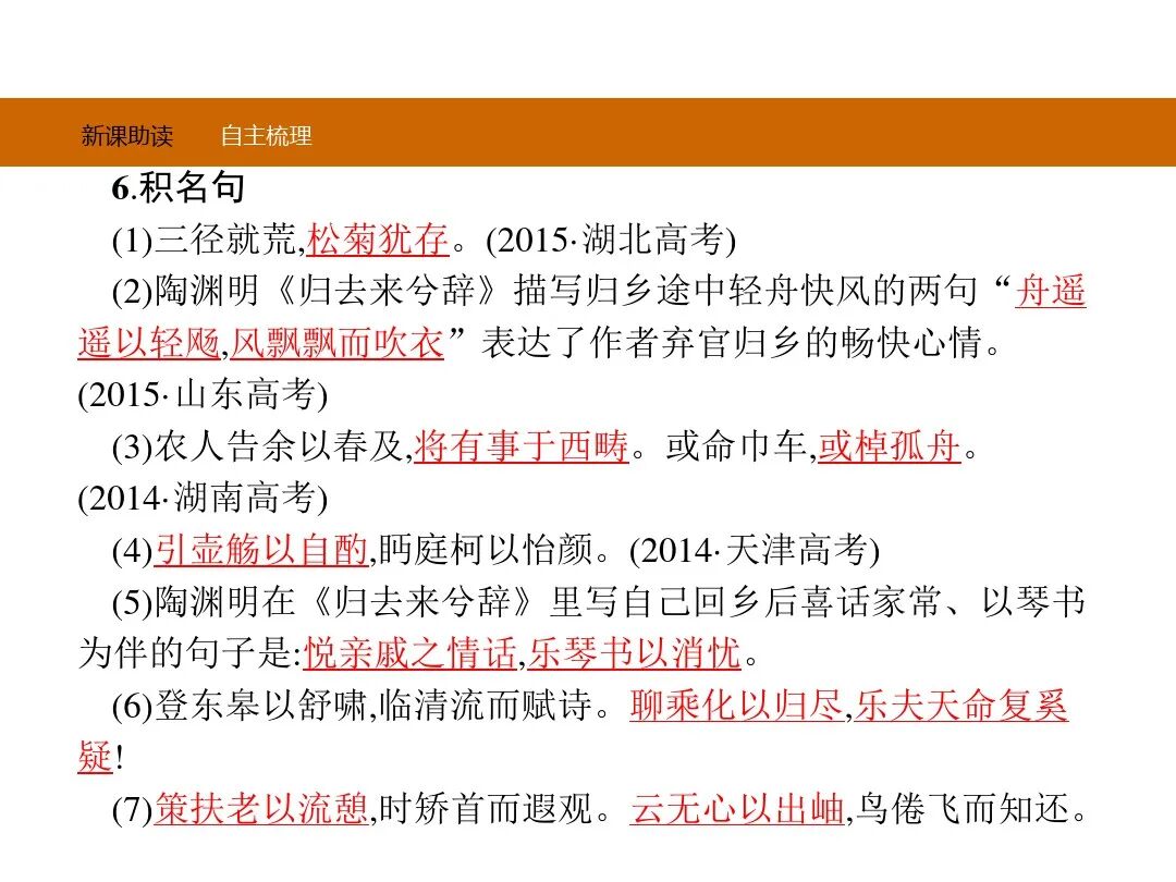 田园生活——“悦亲戚之情话,乐琴书以消忧”、“农人告余以春及,将有事于西畴”、“或命巾车,或棹孤舟”、“既窈窕以寻壑,亦崎岖而经丘”。