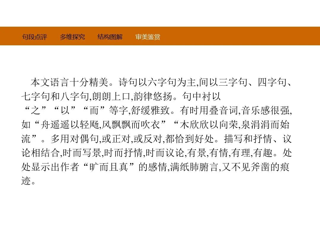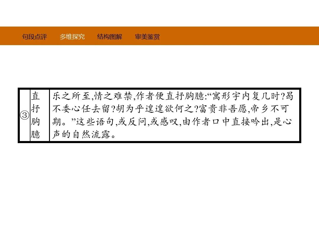 小结:以上几句话写出了作者归家及抵家时的欢快喜悦之情,表现了归家之乐,所以文章在句式有了一定的变化,由六字句至四字句,节奏明显加快。