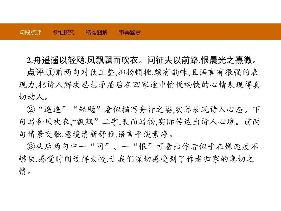 引导体会:“轻飏”、“吹衣”——轻舟摇荡,和风吹衣,表现出冲出牢笼后的前所未有的欢快和迫切之情;前路、晨光;问、恨——归心似箭的心情。