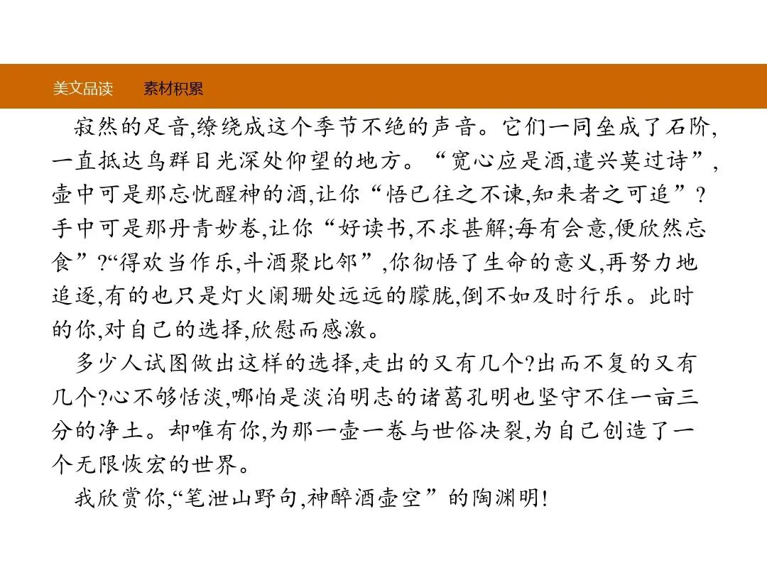 E.“松””菊”正是作者高洁形象的化身。你能用具体形象的文字描述“风飘飘而吹衣”的作者形象吗?这样的形象你能想象到我们古代诗人中的哪一个?