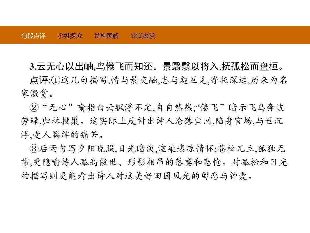4、策扶老以流憩,时矫首而遐观。云无心以出岫,鸟倦飞而知还。景翳翳以将入,抚孤松而盘桓。
