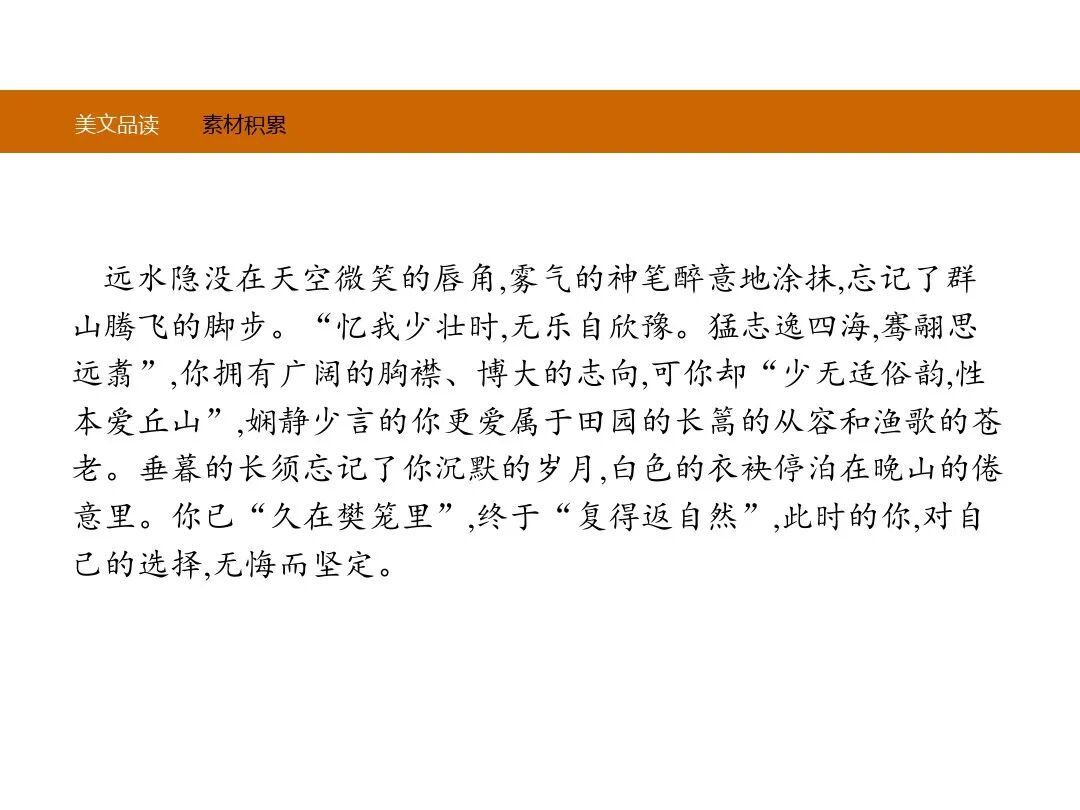 3、归去来兮,田园将芜胡不归?既自以心为形役,奚惆怅而独悲?悟已往之不谏,知来者之可追。