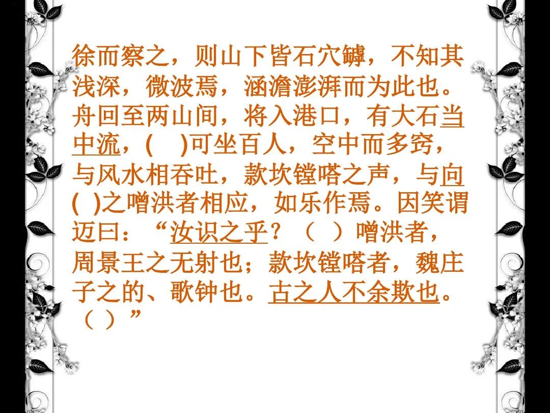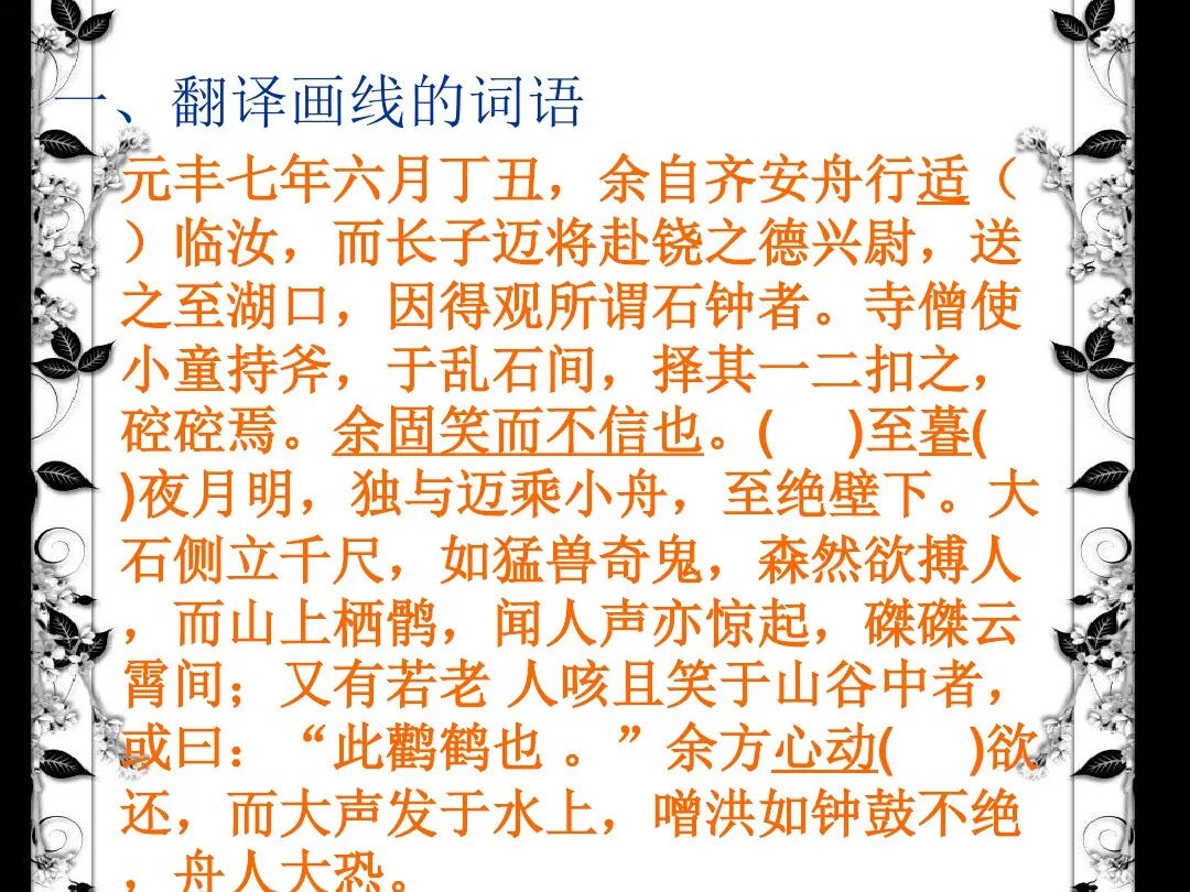 第二段:……寺僧使小童持斧,于乱石间择其一二扣之,硿硿焉,余固笑而不信也。至莫夜月明,独与迈乘小舟,至绝壁下。大石侧立千尺,如猛兽奇鬼,森然欲搏人;而山上栖鹘,闻人声亦惊起,磔磔云霄间;又有若老人咳且笑于山谷中者,或日此鹳鹤也。余方心动欲还,而大声发于水上,噌吰如钟鼓不绝。舟人大恐。徐而察之,则山下皆石穴罅,不知其浅深,微波入焉,涵淡澎湃而为此也。舟回至两山间,有大石当中流,可坐百人,空中而多窍,与风水相吞吐,有窾坎镗鞳之声,与向之噌吰者相应,如乐作焉。因笑谓迈曰:“汝识之乎?噌吰者,周景王之无射也。窾坎镗鞳者,魏庄子之歌钟也。古之人不余欺也!”