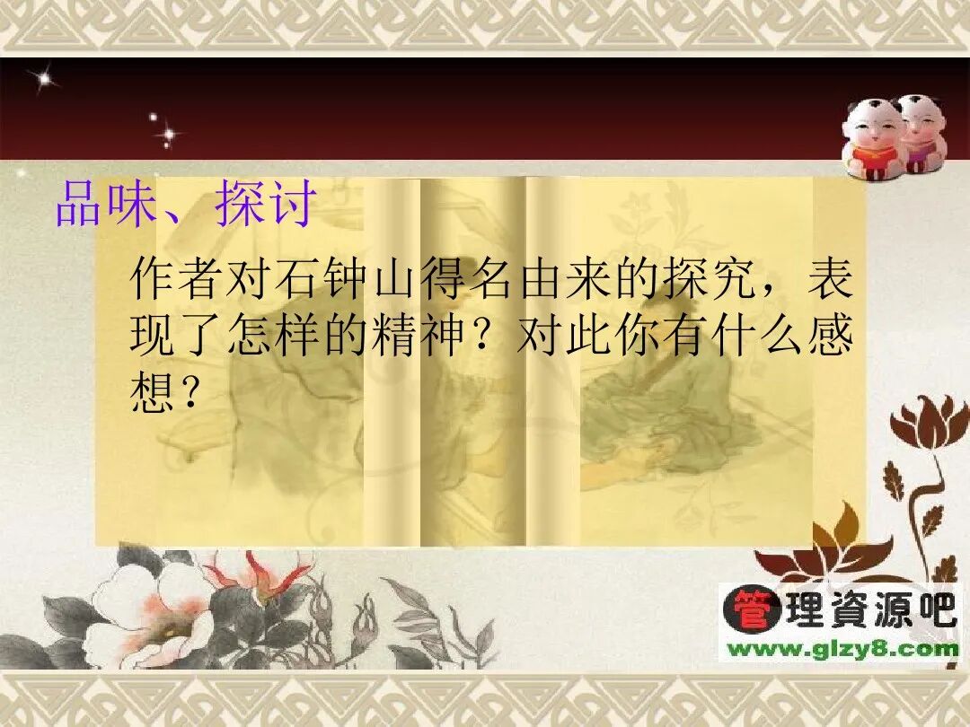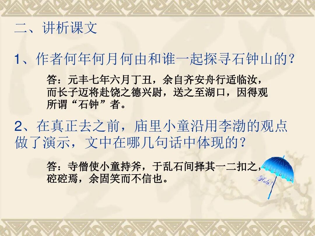 二、首先从文章的内容讲两篇文章都是游记,并且都不重山水风物的描绘,而重在因事说理。《游褒禅山记》从游而未尽兴引发谈人生哲理和治学态度;《石钟山记》用事实破疑问,提出要重实地考察,及对主观臆断的观点。所不同的是《游褒禅山记》的结构是典型的游记体结构,先记游,后议论。记游虽简,但游踪很清楚,体现了游记文的一般特征;而《石钟山记》先议论,再记游,后议论。首先对石钟山命名缘由的两种解释提出质疑,然后通过实地考察去探疑和解疑,最后在解疑的基础上得出结论。在写法上,也有不同。《游褒禅山记》的议论重在“立”;而《石钟山记》的议论是“立”中有“破”。