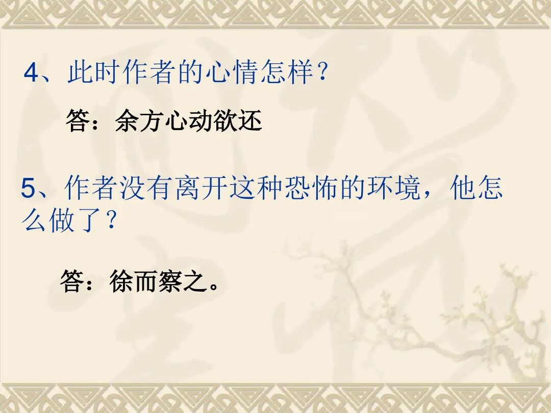 分析:这段先写作者有机会去考察石钟山名之来由,非常简洁而直接地切入正题──小童择石而叩之,硿硿焉,“余固笑而不信”。写出李渤之说被世人广泛地接受,而用一个“固”字表明作者对这种不动脑筋的解释的轻蔑。(固本意为“本来”,这里引申为“自然”,“当然”。)接着写作者暮夜实地考察,又先写环境,描绘出阴森恐怖的气氛,从而让人感悟到探求事情的真相是需要有勇气战胜自己内心的软弱的,同时也点明下一段的“士大夫终不肯以小舟夜泊绝壁”的原因。再写心动欲还时有“大声发于水上”,舟人大恐,而作者却一改刚才的胆怯为欣喜──“徐而察之”,再具体写声音是怎样发出来的,同时为下文的“叹郦元之简”作伏笔。又用回程中,河中“窾坎镗鞳”的大石与先前“噌吰”的绝壁下的穴罅作比。区别两者的声音不同之处:绝壁下,水石相搏,有共鸣,声音雄浑,故曰“噌吰”;大石中,风水相吞吐,风时有时停,水一吞一吐,“窾坎镗鞳”强调节奏鲜明。反复写声源,用以证实郦道元的说法,推翻李渤的“谬论”。最后作者欣喜的告诉独儿子说“古之人不余欺也”。显然,这里的古之人是指郦道元。此段为破疑而写,在释疑的过程中证明郦说,否定李说。