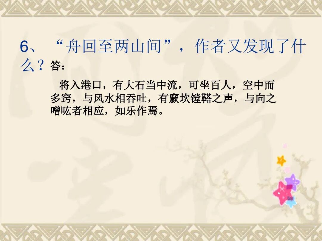 4、《石钟山记》中,描写李渤实地考察石钟山得名原因的句子是“_________,_________,