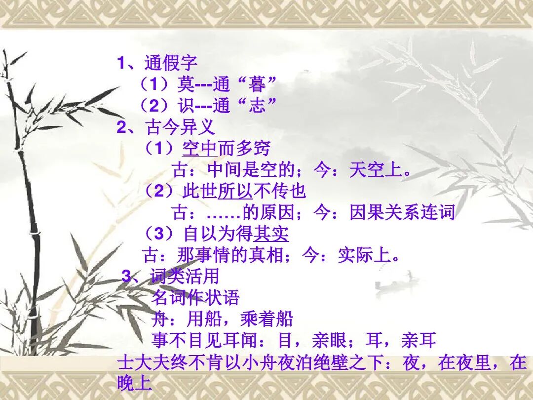 ①词类活用:A使动,例:“虽大风浪不能鸣也”。鸣,使之鸣。B名词做动词:例1.“而此独以钟名”。名,命名。例2.“枹止响腾”。枹,用鼓槌敲击。C形容词作名词:例:“枹止响腾”,响,声音。D名词作状语:例:“目见耳闻”。目,用目,耳,用耳。