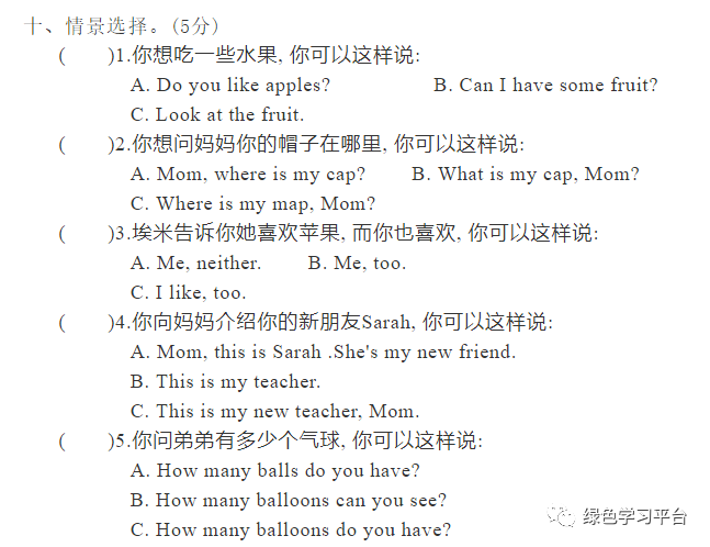 十一、选择合适的答语, 将序号填入题前的括号内。(5分)