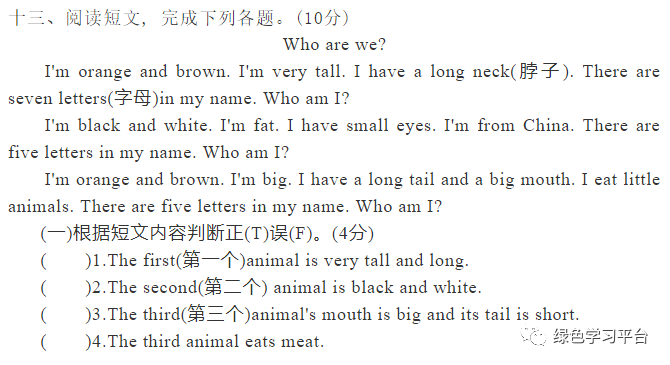 (二)根据短文内容猜出正确的动物, 在相应动物图片下按在短文中出现的先后顺序标出1、2、3。(6分)