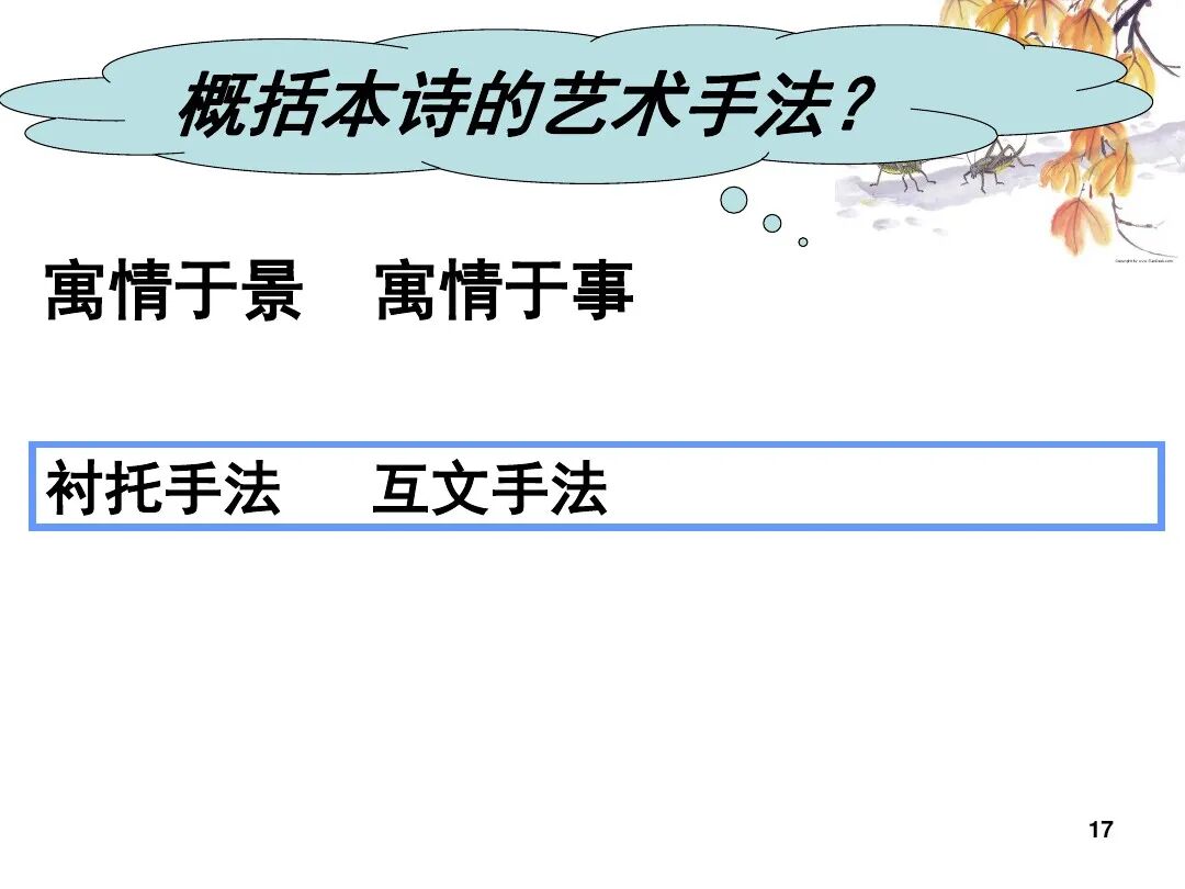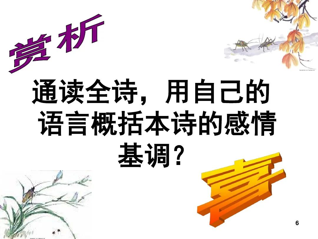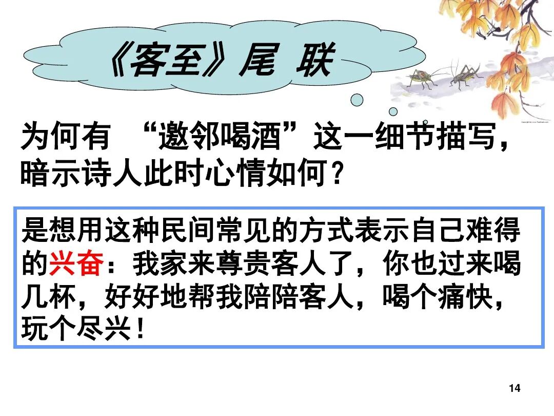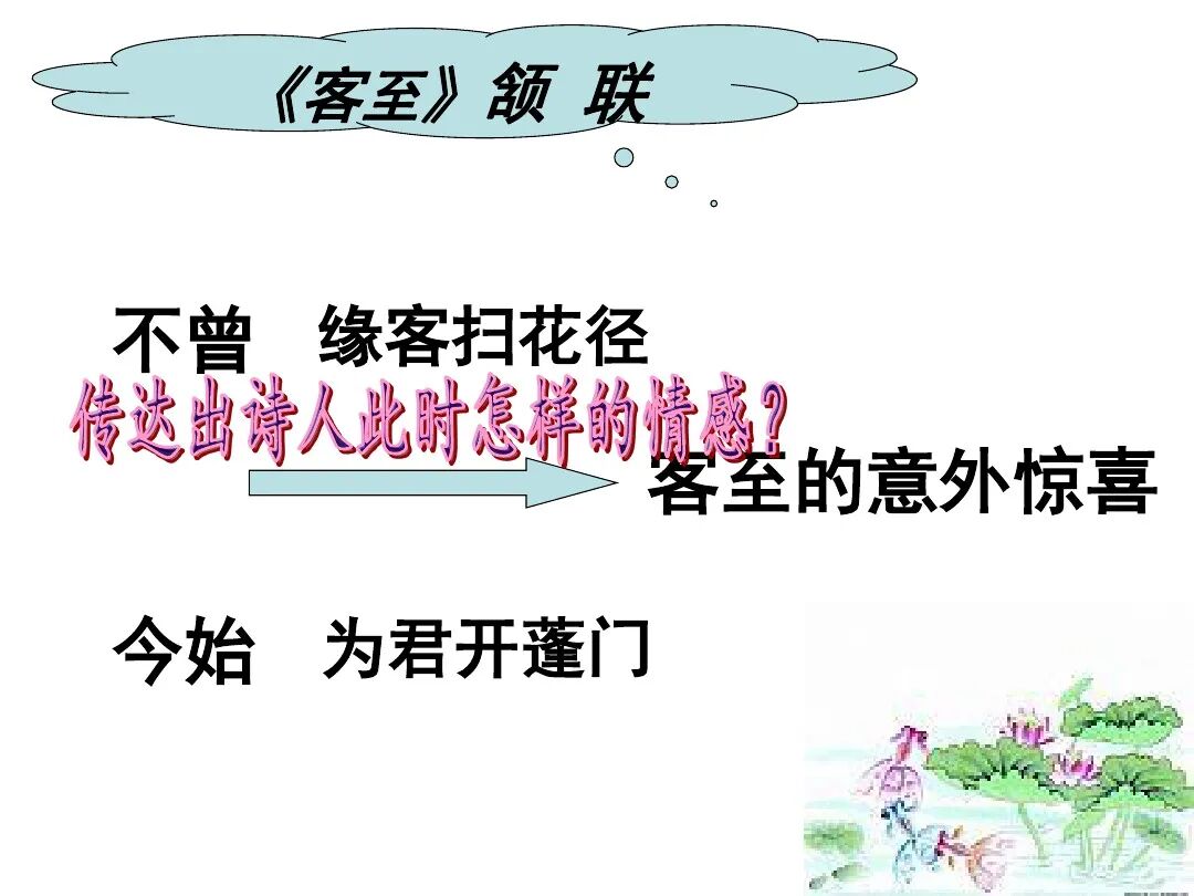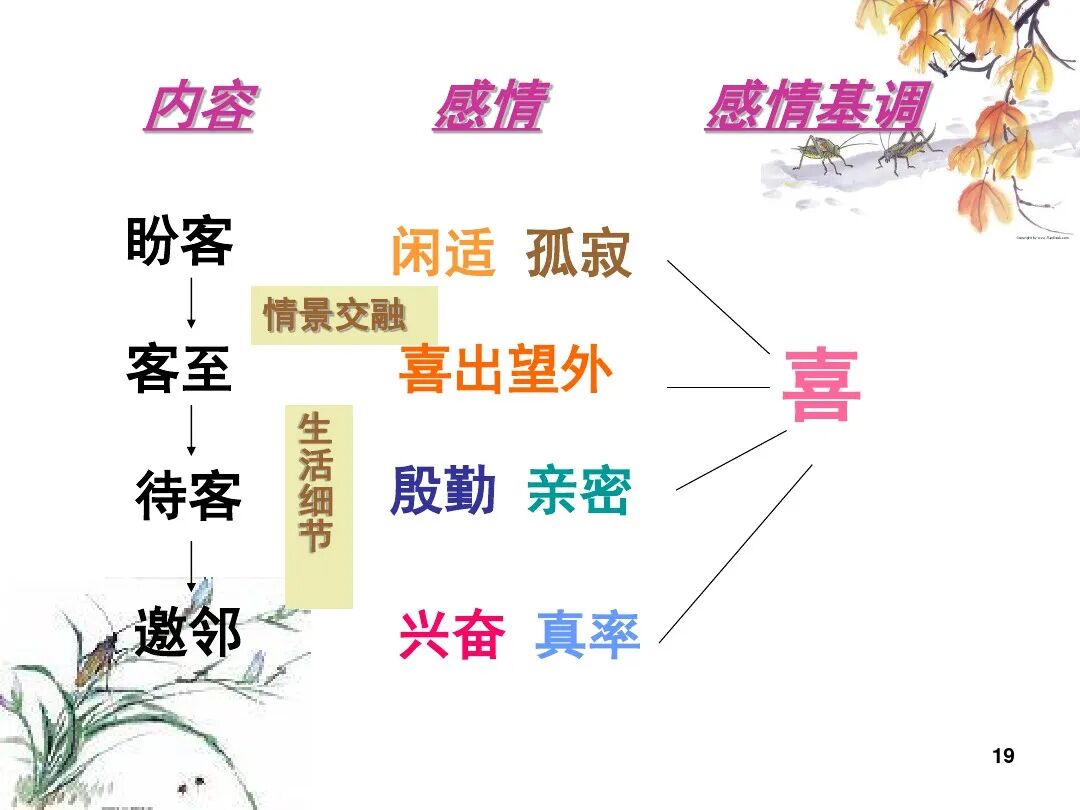 (2)全诗四联,诗人的感情发展变化的过程:孤独——欣喜——融洽——兴奋。