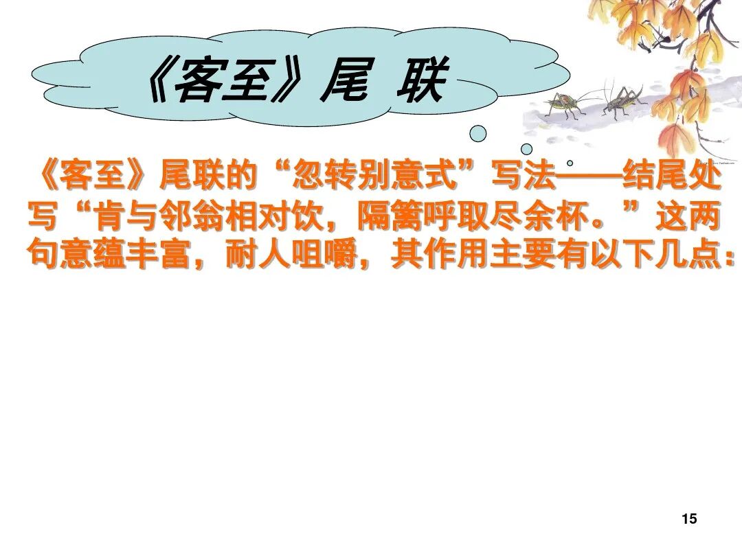 “客至”之情到此似已写足,如果再从正面描写欢悦的场面,显然露而无味,然而诗人却巧妙地以“肯与邻翁相对饮,隔篱呼取尽馀杯”作结,把席间的气氛推向更热烈的高潮。诗人高声呼喊着,请邻翁共饮作陪。这一细节描写,细腻逼真。可以想见,两位挚友真是越喝酒意越浓,越喝兴致越高,兴奋、欢快,气氛相当热烈。就写法而言,结尾两句真可谓峰回路转,别开境界。