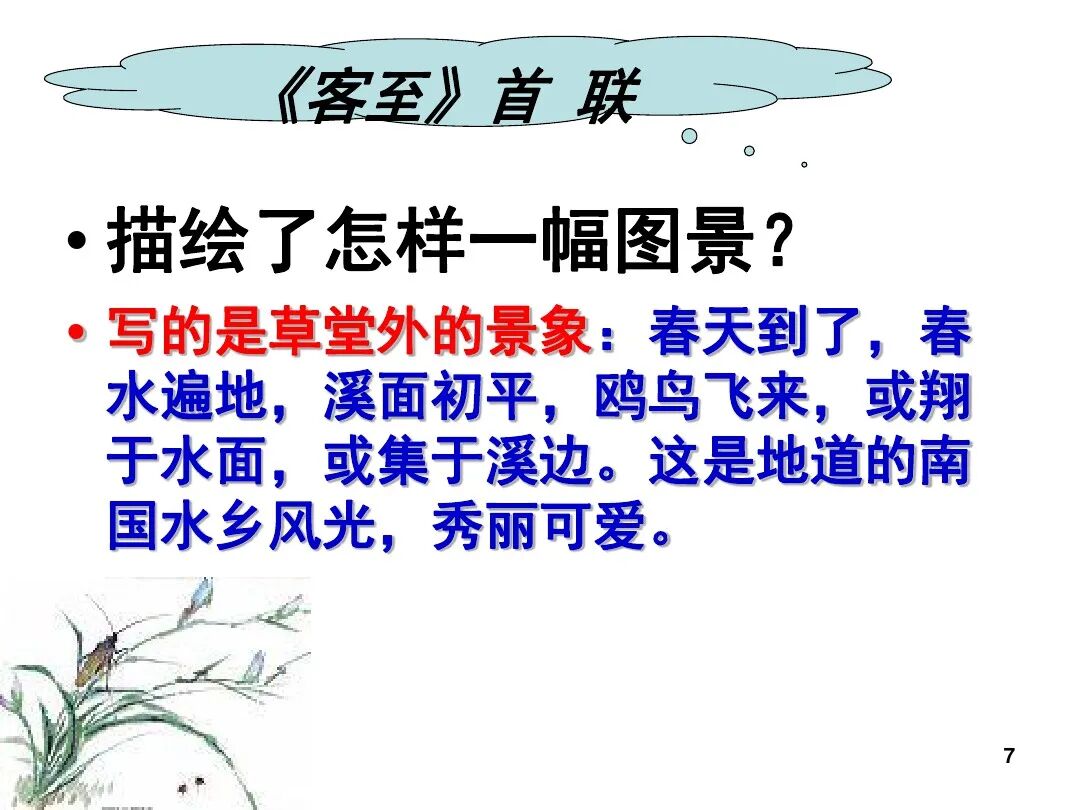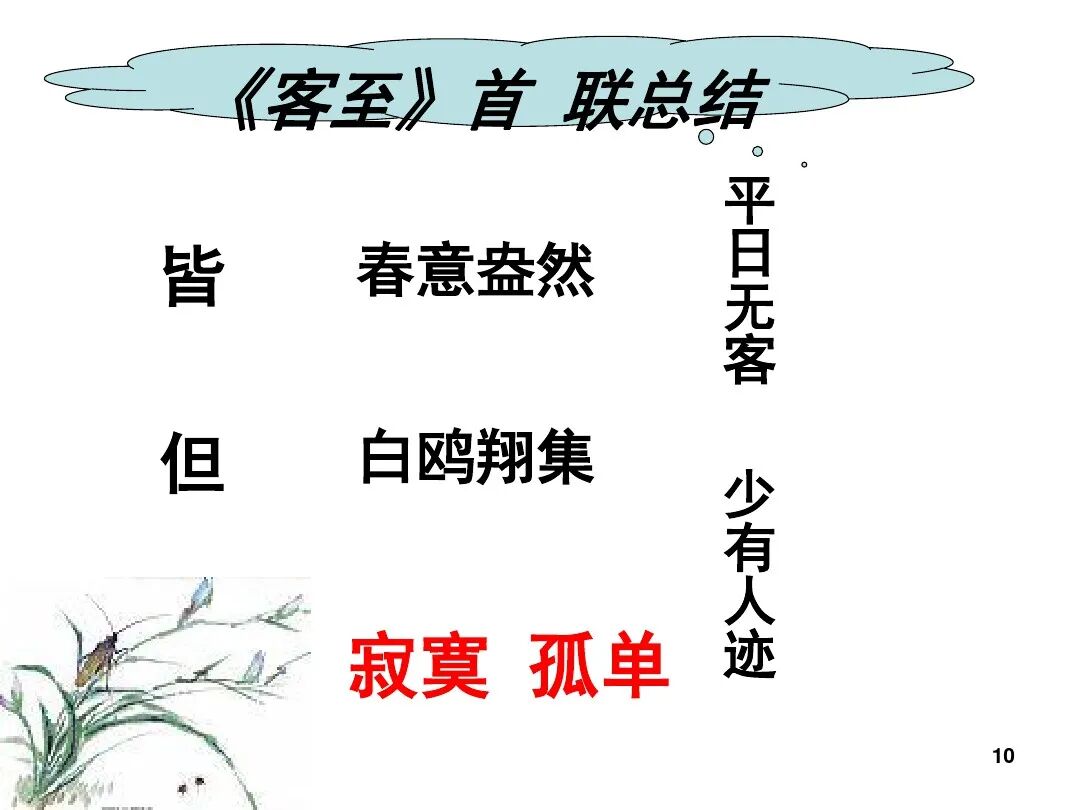 首联先从户外的景色着笔,点明客人来访的时间、地点和来访前夕作者的心境。“舍南舍北皆春水”,把绿水缭绕、春意荡漾的环境表现得十分秀丽可爱。这就是临江近水的成都草堂。“皆”字暗示出春江水势涨溢的情景,给人以江波浩渺、茫茫一片之感。群鸥,在古人笔下常常作水边隐士的伴侣,它们“日日”到来,点出环境清幽僻静,为作者的生活增添了隐逸的色彩。“但见”,含弦外之音:群鸥固然可爱,而不见其他的来访者,不是也过于单调么!作者就这样寓情于景,表现了他在闲逸的江村中的寂寞心情。这就为贯串全诗的喜客心情,巧妙地作了铺垫。