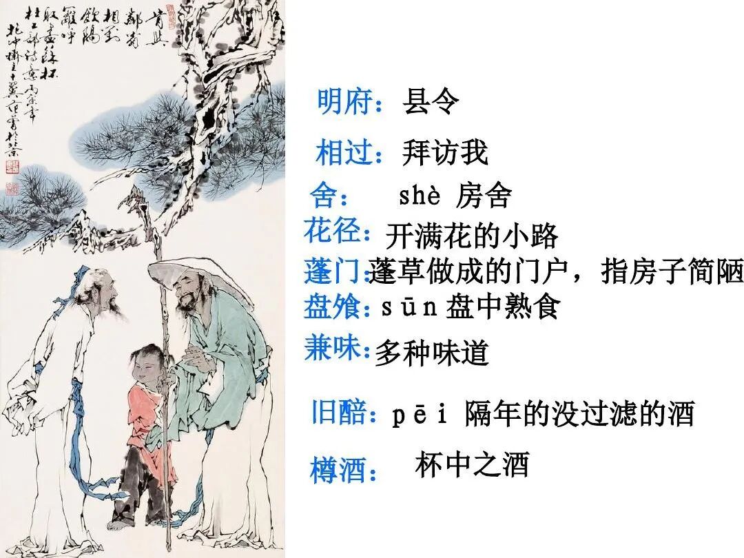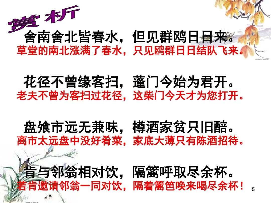 草堂的南北绿水缭绕、春意荡漾,只见鸥群日日结队飞来。长满花草的庭院小路没有因为迎客而打扫,只是为了你的到来,我家草门首次打开。离集市太远盘中没好菜肴,家境贫寒只有陈酒浊酒招待。如肯与邻家老翁举杯一起对饮,那我就隔着篱笆将他唤来。5.全班齐读。