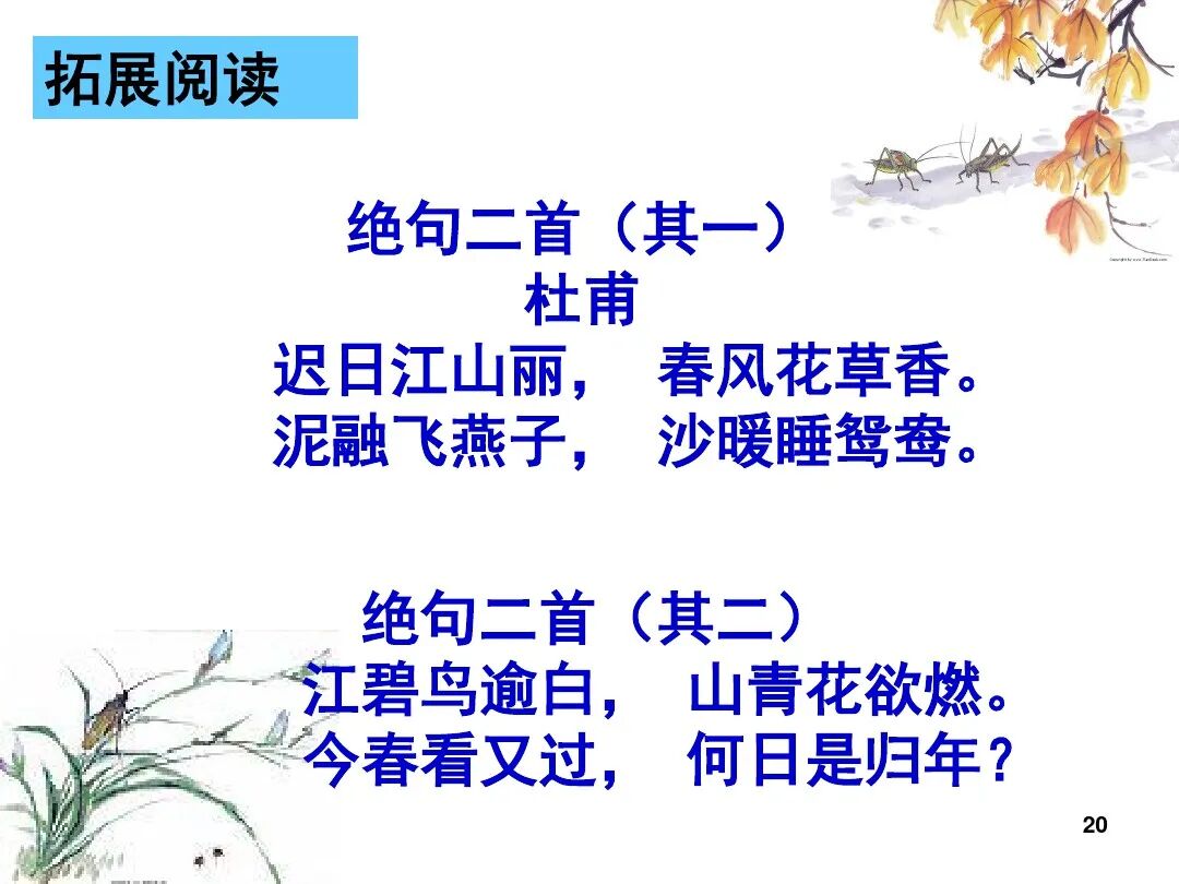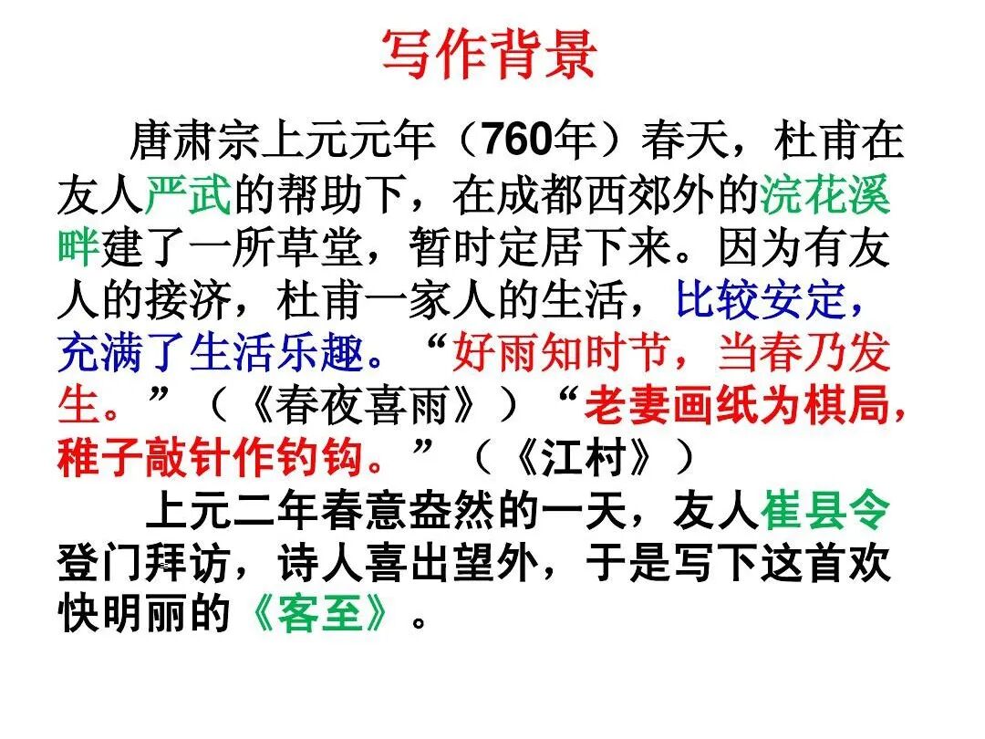 2. 写作背景:唐肃宗上元元年(760)春天,杜甫在严武等友人帮助下,于成都西郊建了一所草堂,暂时定居下来,生活上也有人接济他,从“老妻画纸为棋局,稚子敲针作钓钩”(《江村》)可以看出,这一时期他一家人的日子过得倒也平稳,有了生活的情趣。这时期他也写了不少的闲适诗。这首诗是第二年春天写的。
