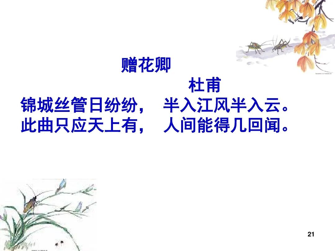 (3)诗用第一人称,表达质朴流畅,自然亲切,与内容非常协调,形成一种欢快淡雅的情调,与杜甫其他律诗字斟句酌的沉郁顿挫风格确实不大一样。