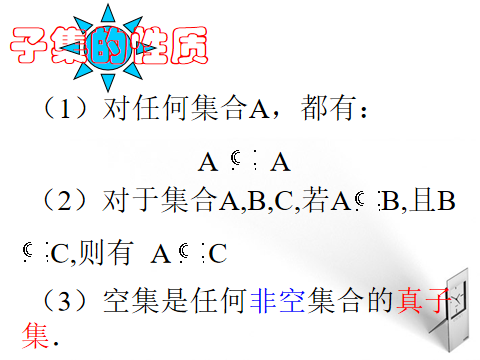 (4)Venn图:用平面上一条封闭曲线(圆、椭圆、长方形等)的内部代表集合,这种图称为Venn图.(5)空集:不含任何元素的集合,叫做空集,记为∅.(1)空集是任何集合的子集,是任何非空集合的真子集;(3)对于集合A,B,C,如果A⊆B,且B⊆C,那么A⊆C; (4)含有n个元素的集合有2n个子集,有2n-1个真子集,有2n-2个非空真子集.