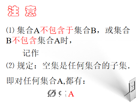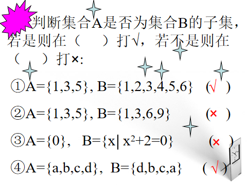 (1)一般地,对于两个集合A,B,如果集合A中任何一个元素都是集合B中的元素,就称集合A为集合B的子集.![]()
