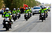 2020年4月5日,梧州市第一批、第二批驰援湖北抗疫医疗队平安归来,梧州交警一路领航护送,当交警与医疗队乘坐的车辆以相同的速度匀速前进时,如图所示,若认为护送的交警是静止的,则选择的参照物是( )