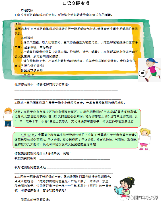 一、1.点拨:转述通知要注意:一是说清楚时间地点人物这些关键的因素。二是不能漏下通知里面的注意事项,抓住要点。答案:参加足球俱乐部的同学们要注意了,新星足球俱乐部将于本周六上午9点进行在足球俱乐部训练场进行一场足球综合测试,选拔全市小学生足球赛的参赛队员。请同学们们和家长们应带好口罩,注意保暖,带好热水和训练衣裤、护腿板、袜子、球鞋这些装备,在保暖基础上还要保证活动不会太受束缚,从而影响测试成绩。请大家保持场地卫生,不要乱扔垃圾和随地吐痰,保护好我们共同的训练场。