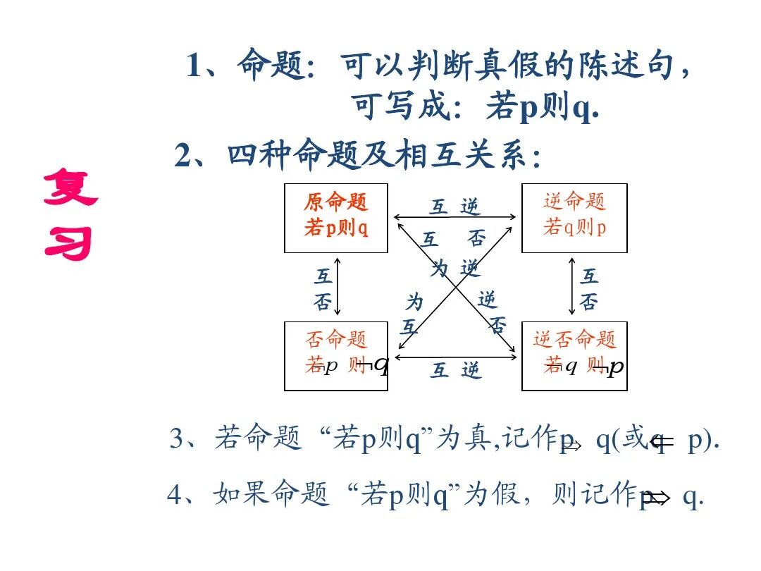 (3)交换命题的条件和结论,并且同时否定,所得的新命题就是原命题的逆否命题。