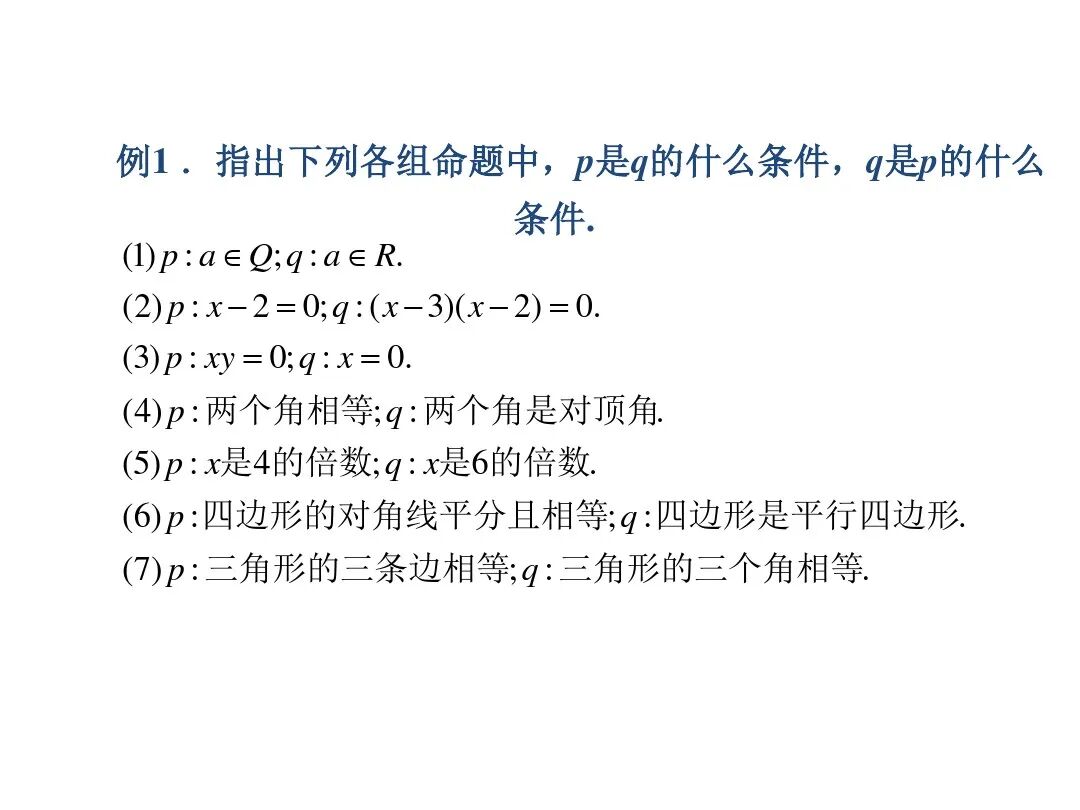 例1 指出下列各题中,p是q的什么条件(在“充分不必要条件”“必要不充分条件”“充要条件”“既不充分也不必要条件”中选出一种作答).
