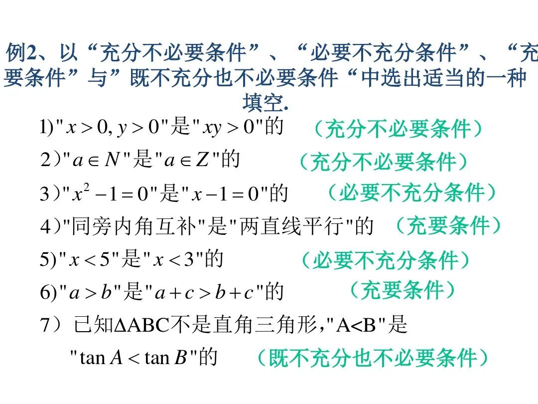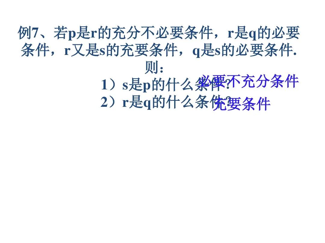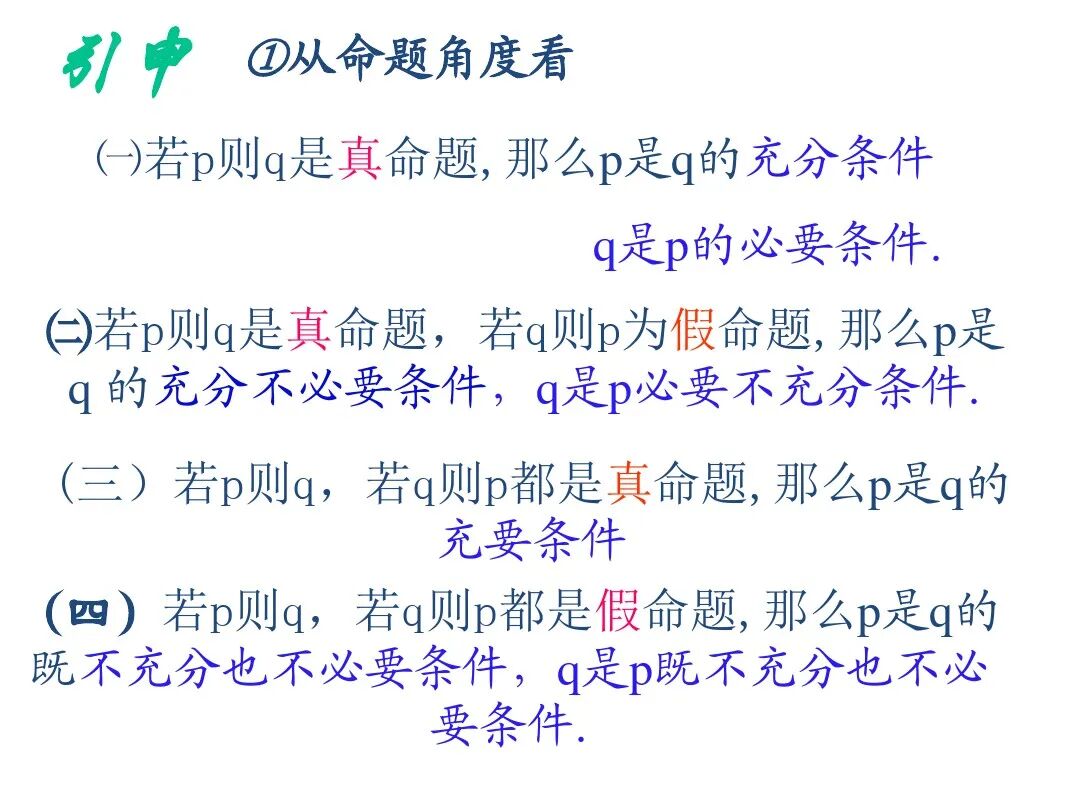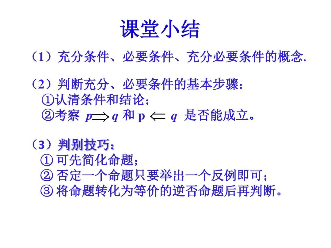 2.由于“充分条件与必要条件”是四种命题的关系的深化,他们之间存在这密切的联系,故在判断命题的条件的充要性时,可考虑“正难则反”的原则,即在正面判断较难时,可转化为应用该命题的逆否命题进行判断。一个结论成立的充分条件可以不止一个,必要条件也可以不止一个。