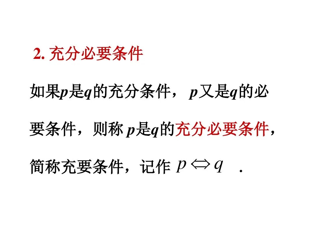 一般地,如果既有p⇒q,又有q⇒p,就记作p⇔q.此时,我们说p是q的充分必要条件,简称充要条件.显然,如果p是q的充要条件,那么q也是p的充要条件,即如果p⇔q,那么p与q互为充要条件.